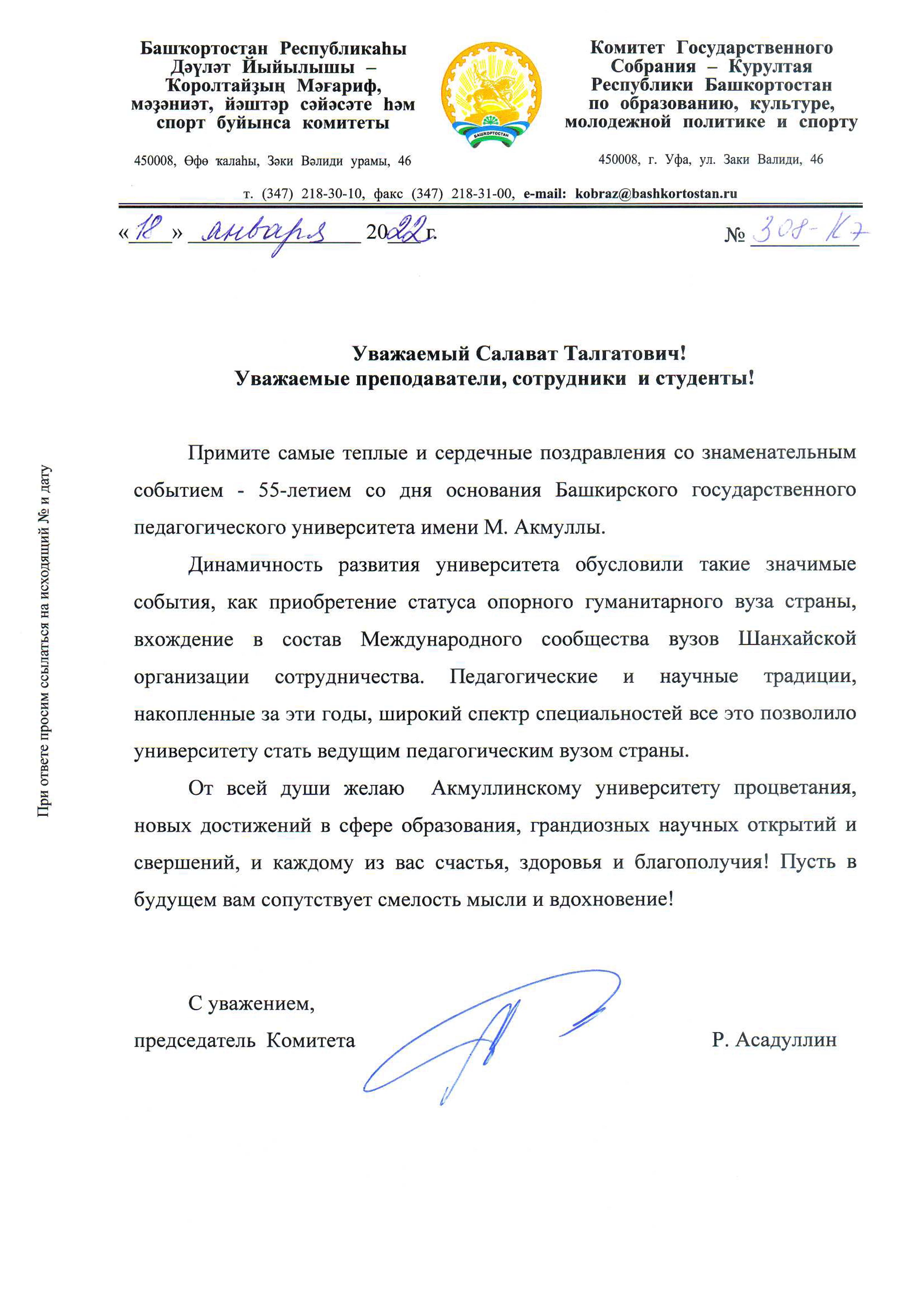 С 55-летием со дня основания Башкирского государственного педагогического университета имени М. Акмуллы поздравляет председатель Комитета Государственного Собрания - Курултая Республики Башкортостан по образованию, культуре, молодежной политике и спорту Раиль Асадуллин.