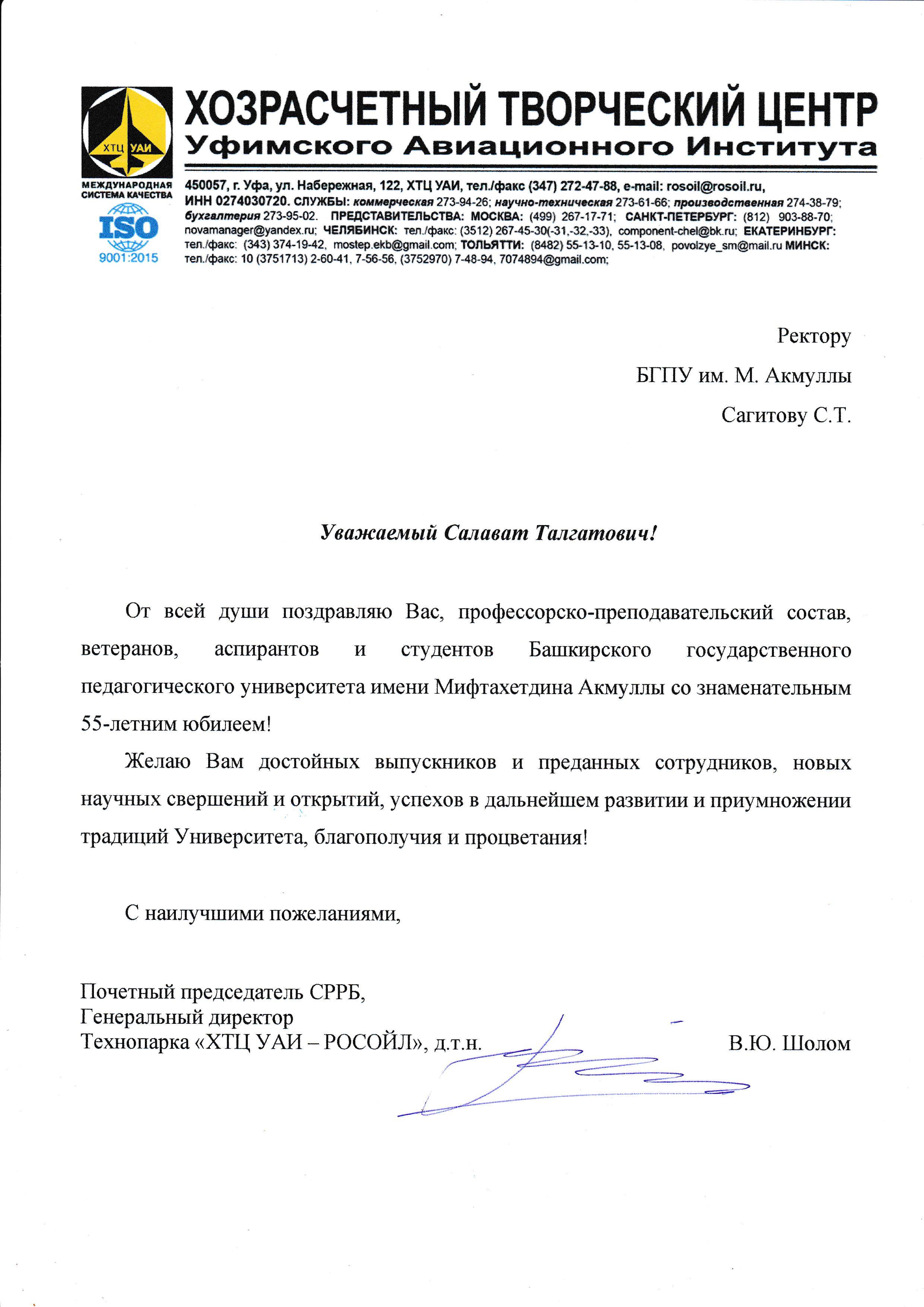 С 55-летием со дня основания Башкирского государственного педагогического университета имени М. Акмуллы поздравляет Почетный председатель СРРБ, Генеральный директор Технопарка «Хозрасчетный творческий центр Уфимского авиационного института–РОСОЙЛ», д.т.н. Шолом Владимир Юрьевич.