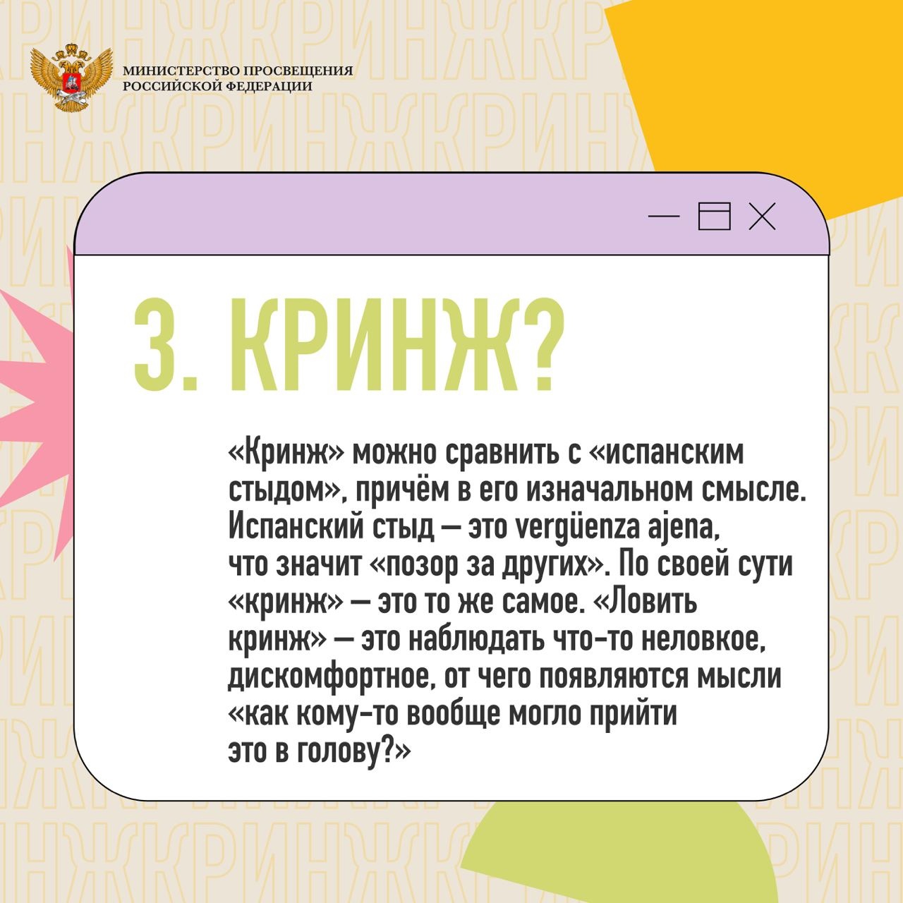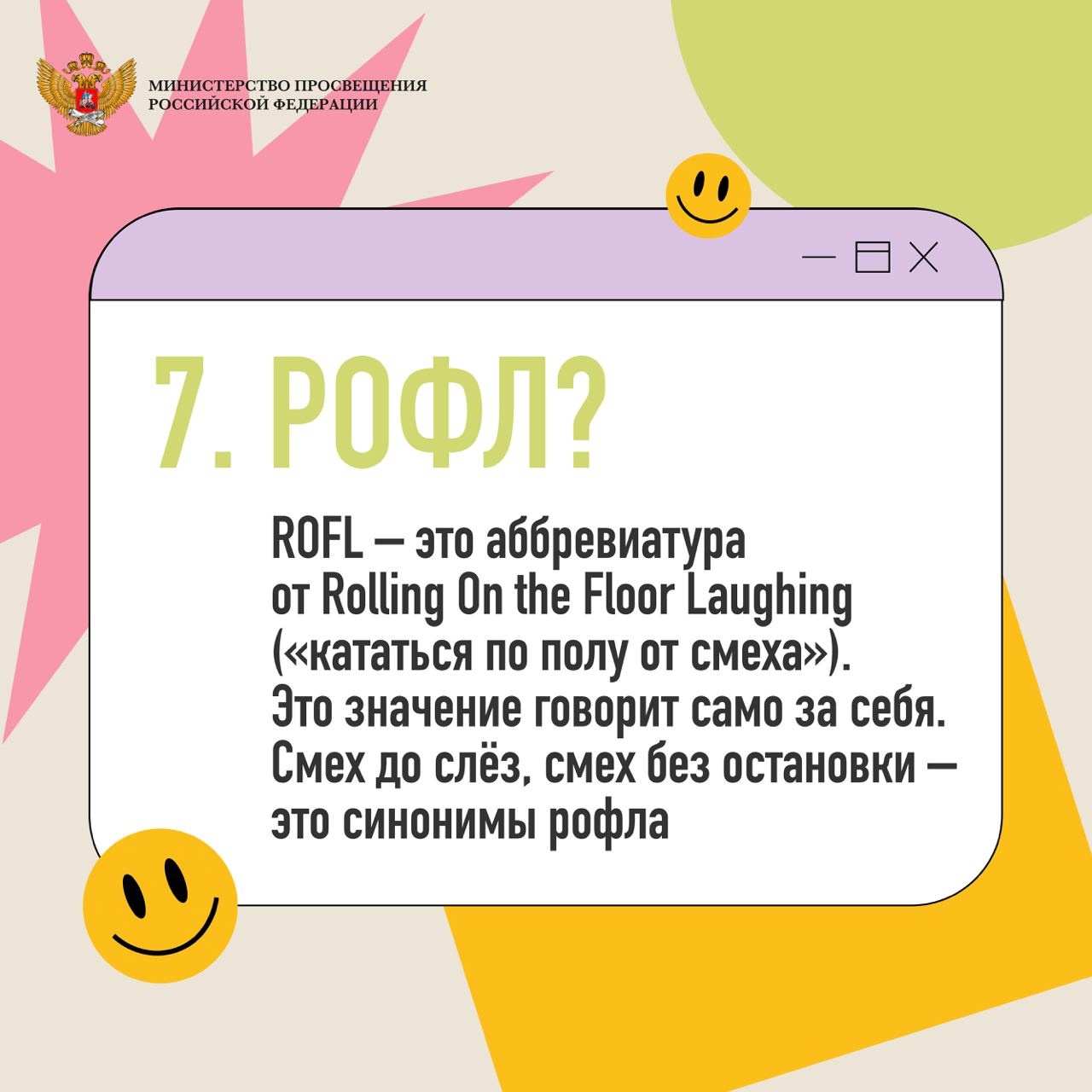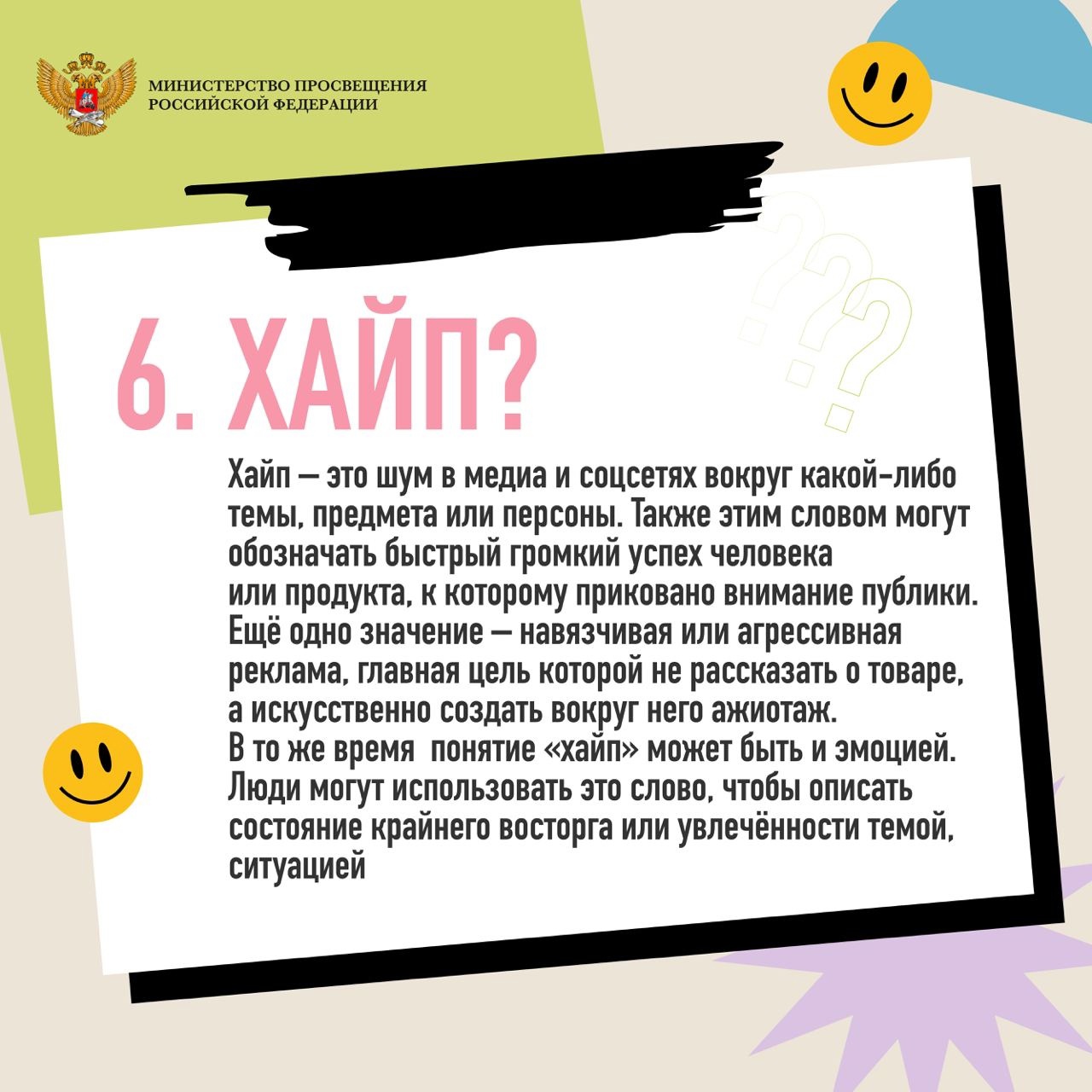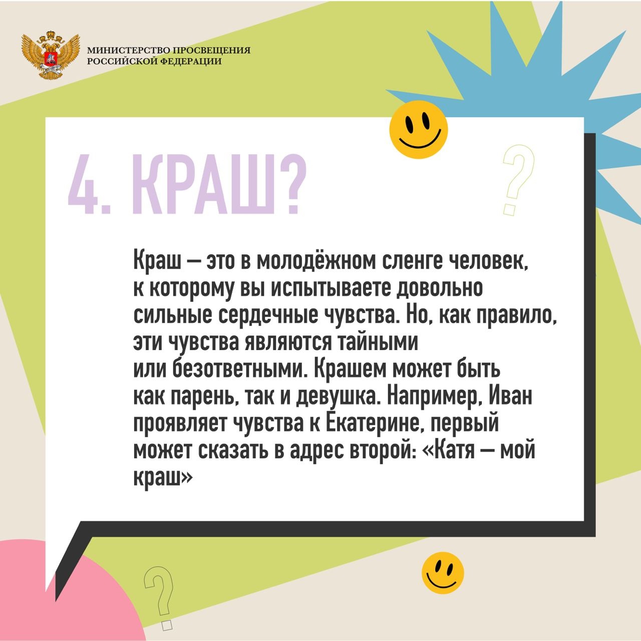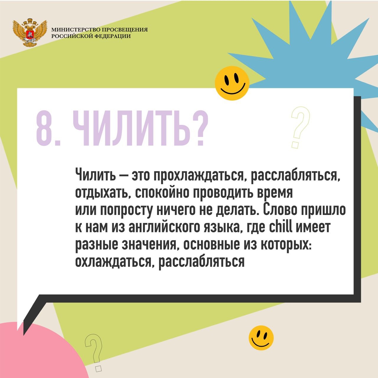 Порой родители, преподаватели и люди старшего возраста не всегда понимают язык общения молодых людей, так называемый «молодёжный сленг». Министерство просвещения Российской Федерации составило подборку часто употребляемых слов с их значениями.