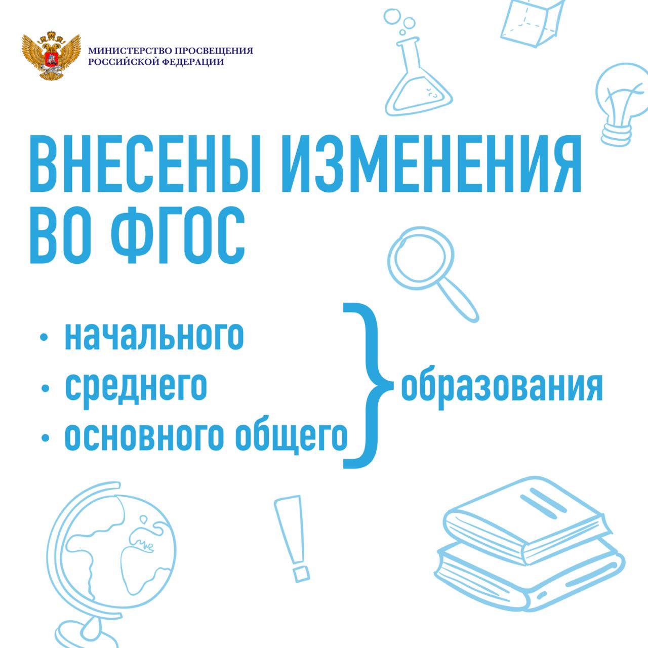 Обновлено содержание Федеральных государственных образовательных стандартов начального и основного общего образования, внесены изменения во ФГОС среднего общего образования. Обновление проведено в соответствии с принципом единства образовательного пространства, одного из основных принципов государственной политики в сфере образования (Федеральный закон «Об образовании в Российской Федерации», статья 3). Об этом сообщается на сайте  Минпросвещения России.