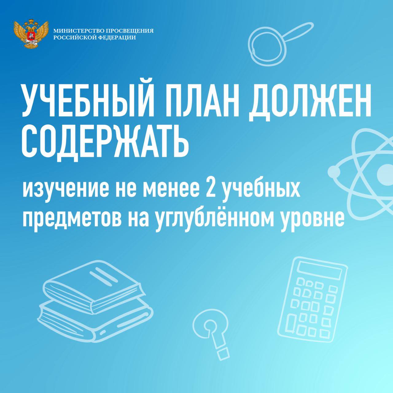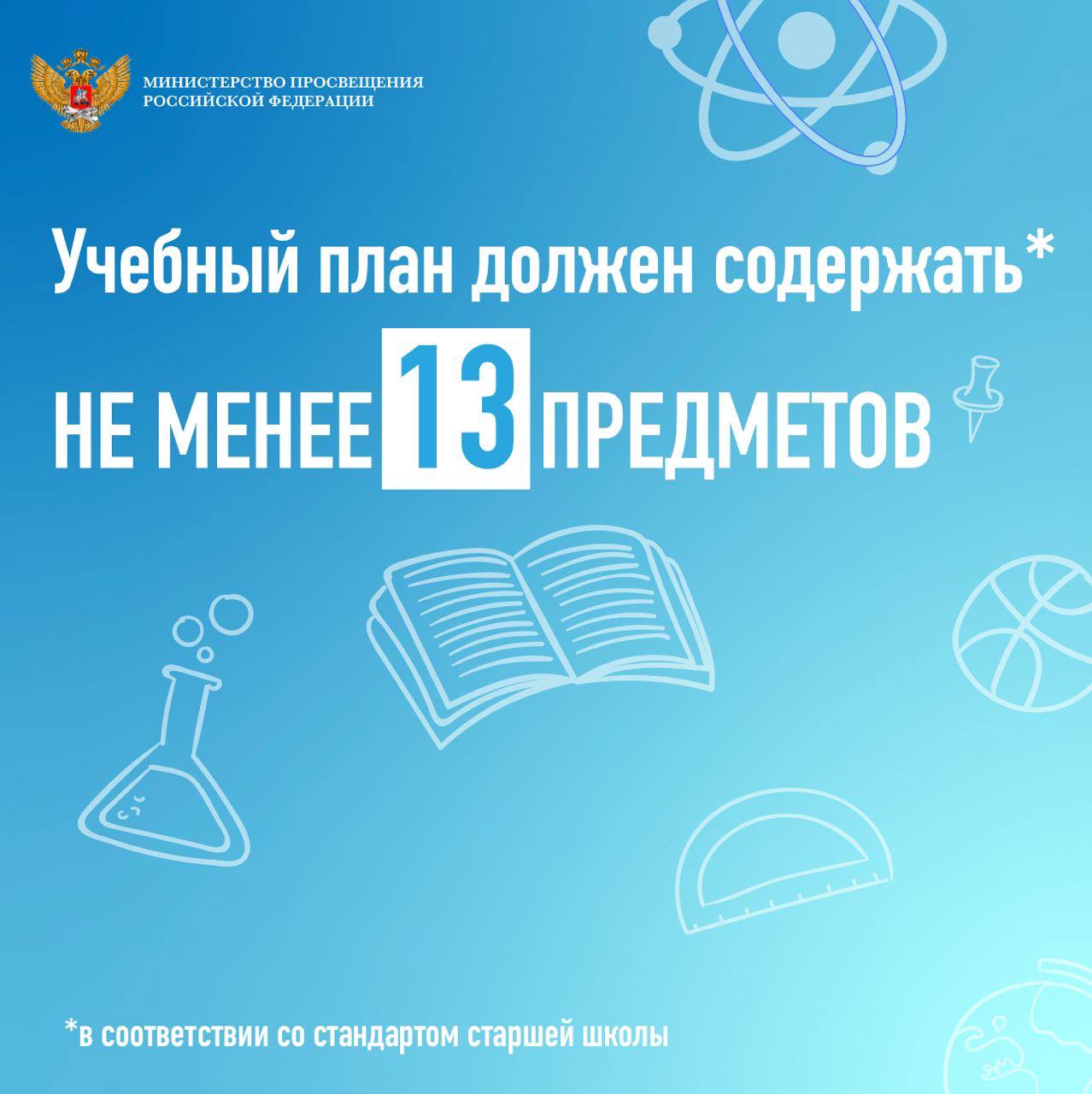 В соответствии со стандартом старшей школы учебный план обучения должен содержать не менее 13 учебных предметов (русский язык, литература, иностранный язык, математика, информатика, история, география, обществознание, физика, химия, биология, физическая культура и основы безопасности жизнедеятельности) и предусматривать изучение не менее двух учебных предметов на углубленном уровне в зависимости от выбранного профиля обучения.
