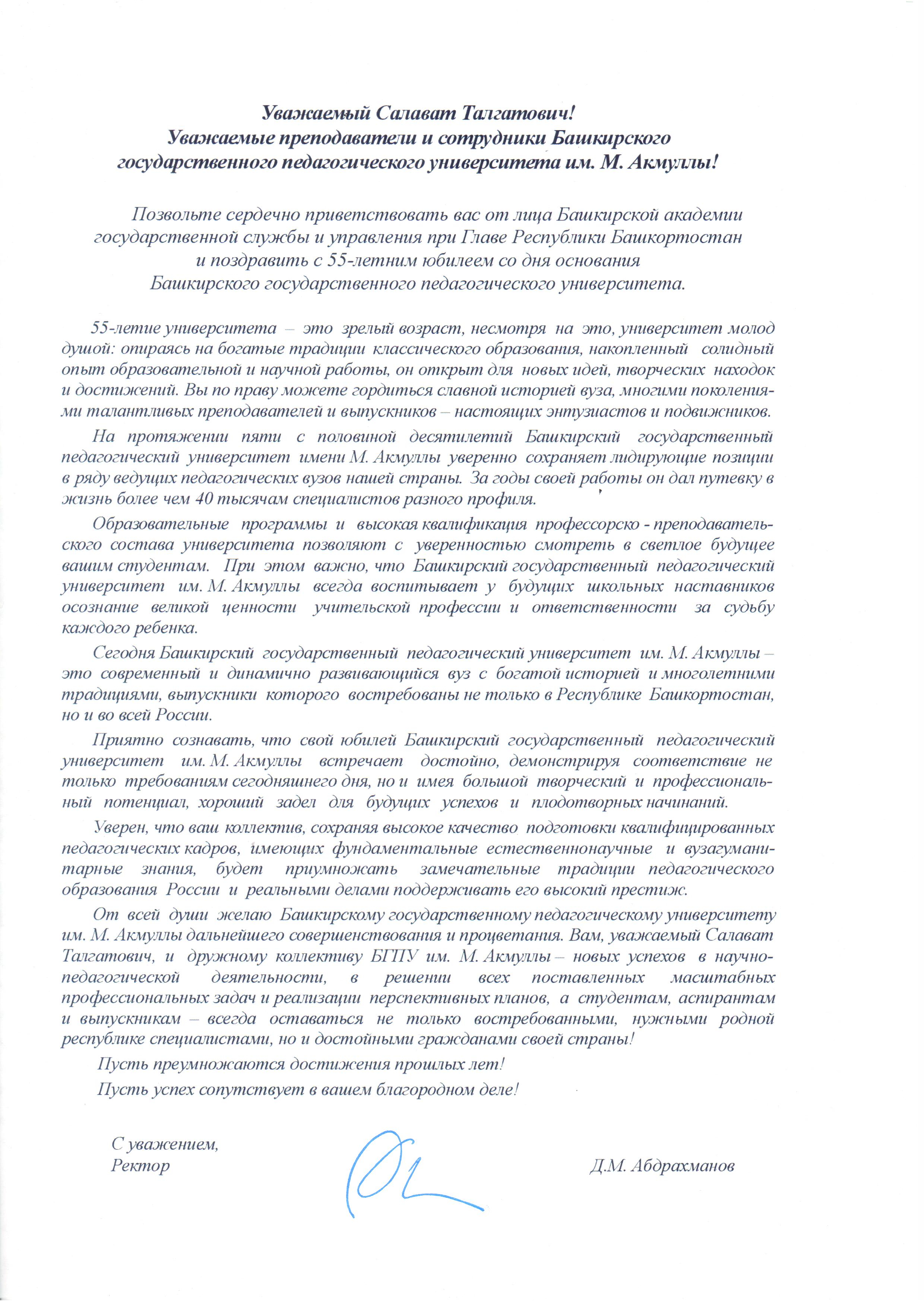С 55-летием со дня основания Башкирского государственного педагогического университета имени М. Акмуллы поздравляет ректор Башкирской академии государственной службы и управления при Главе Республики Башкортостан Абдрахманов Данияр Мавлиярович.