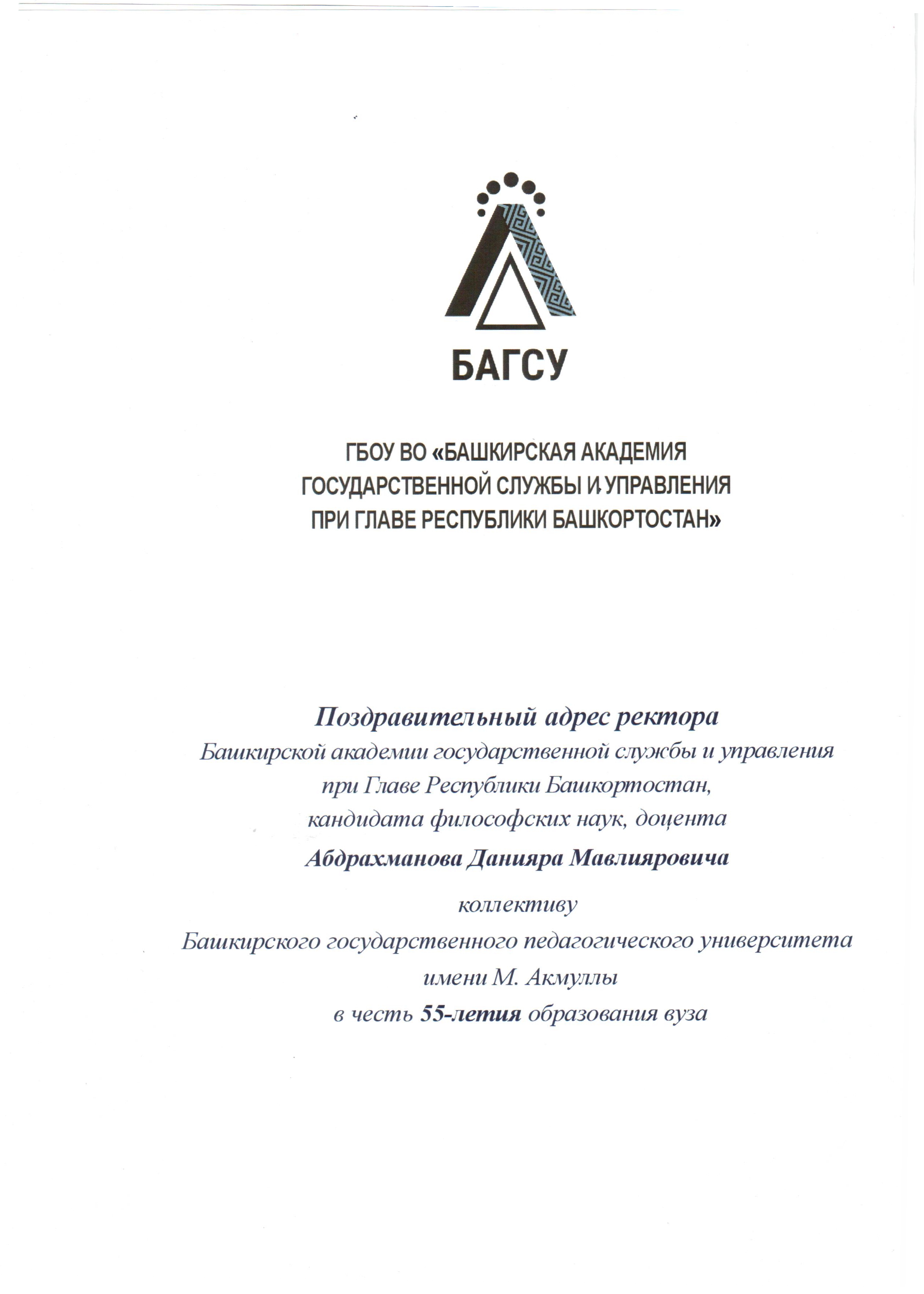 Позвольте сердечно приветствовать вас от лица Башкирской академии государственной службы и управления при Главе Республики Башкортостан и поздравить с 55-летним юбилеем со дня основания Башкирского государственного педагогического университета.