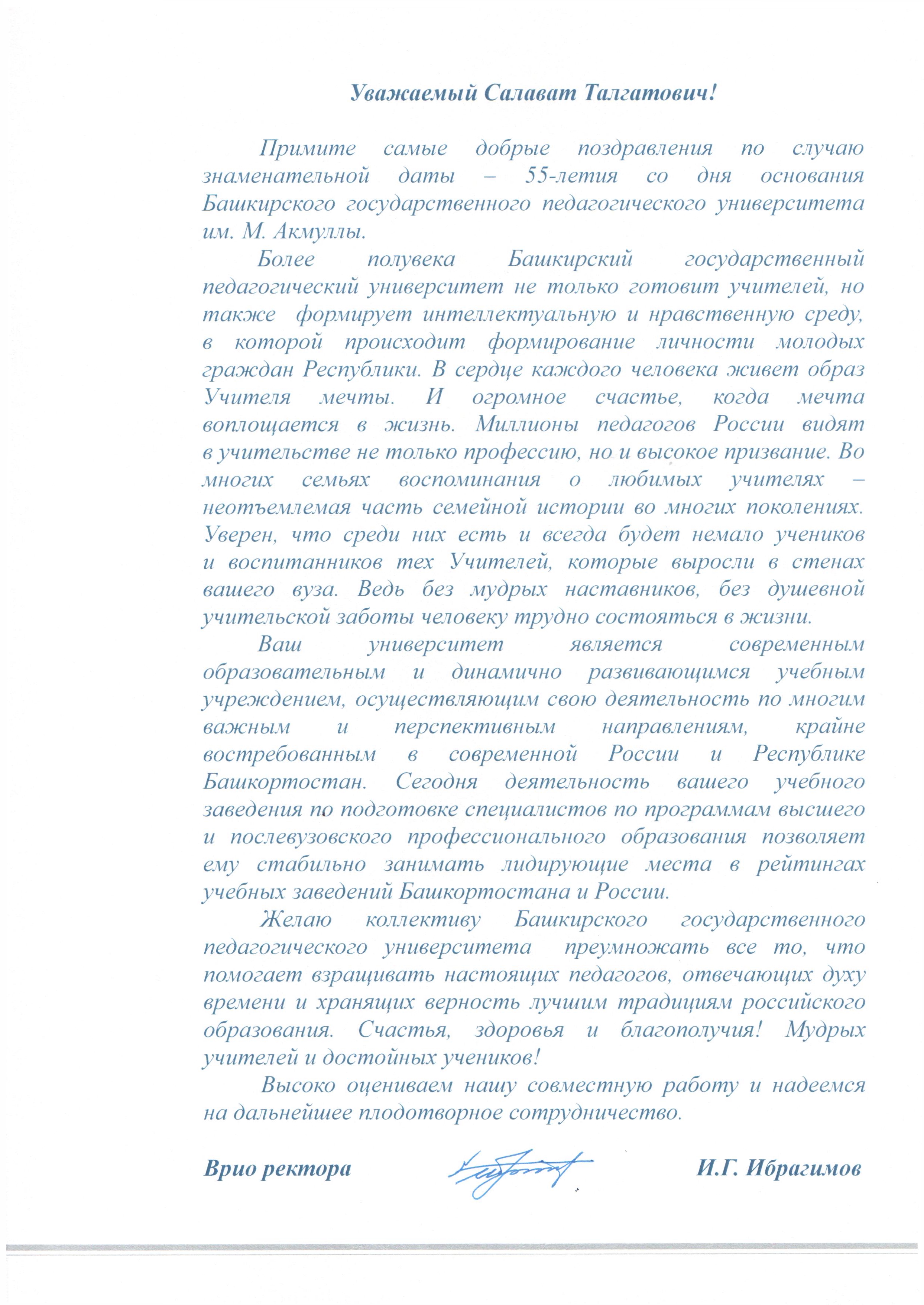 В адрес ректора БГПУ им. М. Акмуллы Салавата Сагитова продолжают поступать поздравительные письма и телеграммы.