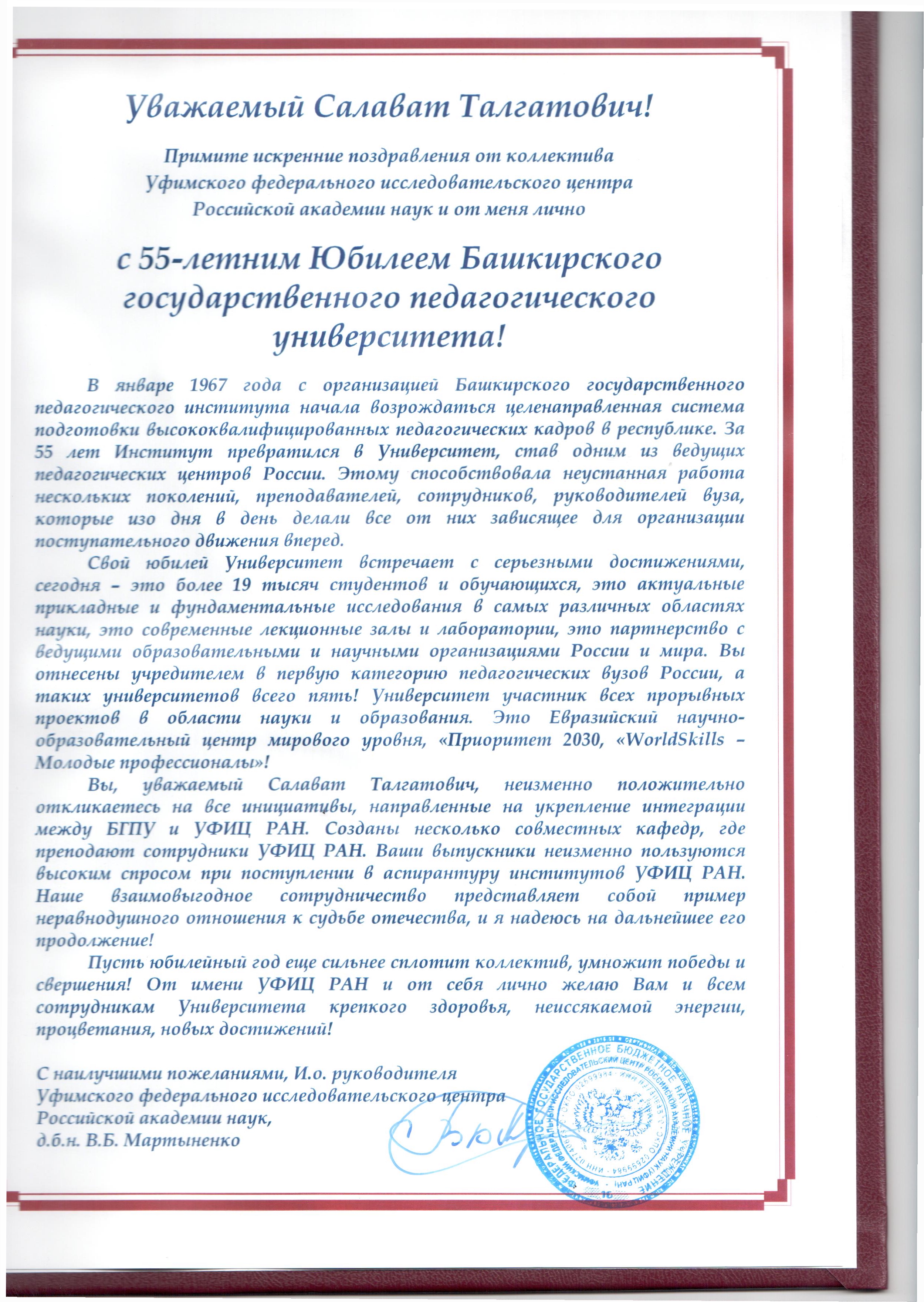 Примите искренние поздравления от коллектива Уфимского федерального исследовательского центра Российской академии наук и от меня лично с 55-летним юбилеем Башкирского государственного педагогического университета!