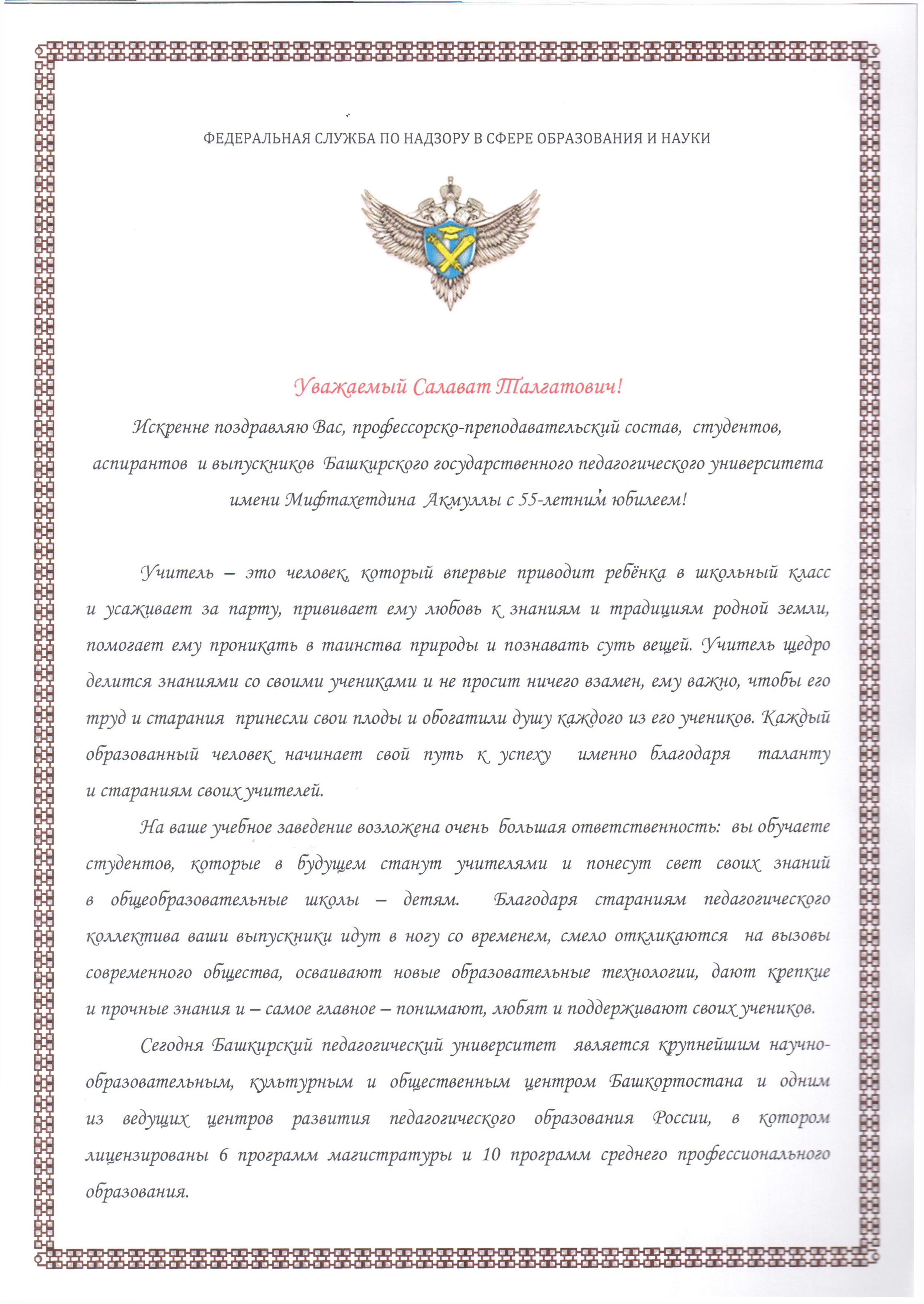 С 55-летием БГПУ им. М. Акмуллы поздравляет Федеральная служба по надзору в сфере образования и науки