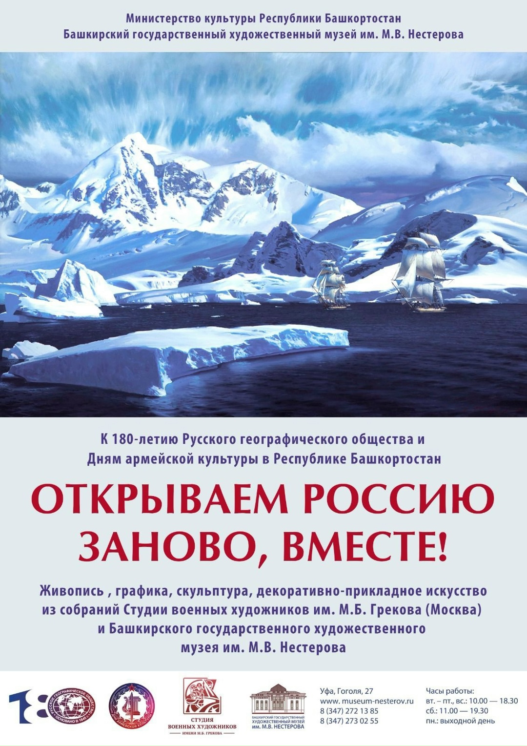 • выставка «Открываем Россию заново, вместе!» в Башкирском государственном художественном музее им. М.В. Нестерова, приуроченная к 180-летию Русского географического общества и представляющая произведения членов Студии военных художников им. М.Б. Грекова (Москва) и произведения художников Башкортостана и России из собрания музея;