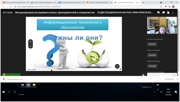 19 мая 2021 года канд.пед.наук, доцент кафедры профессионального и социального образования Цилюгина И.Б. приняла участие в работе VI Международной дистанционной научно-практической конференции «Современные проблемы школьного образования», организованной Российской Академией Естествознания (Международная ассоциации ученых, преподавателей и специалистов). На конференции обсуждались вопросы использования дистанционных образовательных технологий (проблемы и риски), особенности дистанционной образовательной деятельности, основные принципы обучения в Болонской системе.