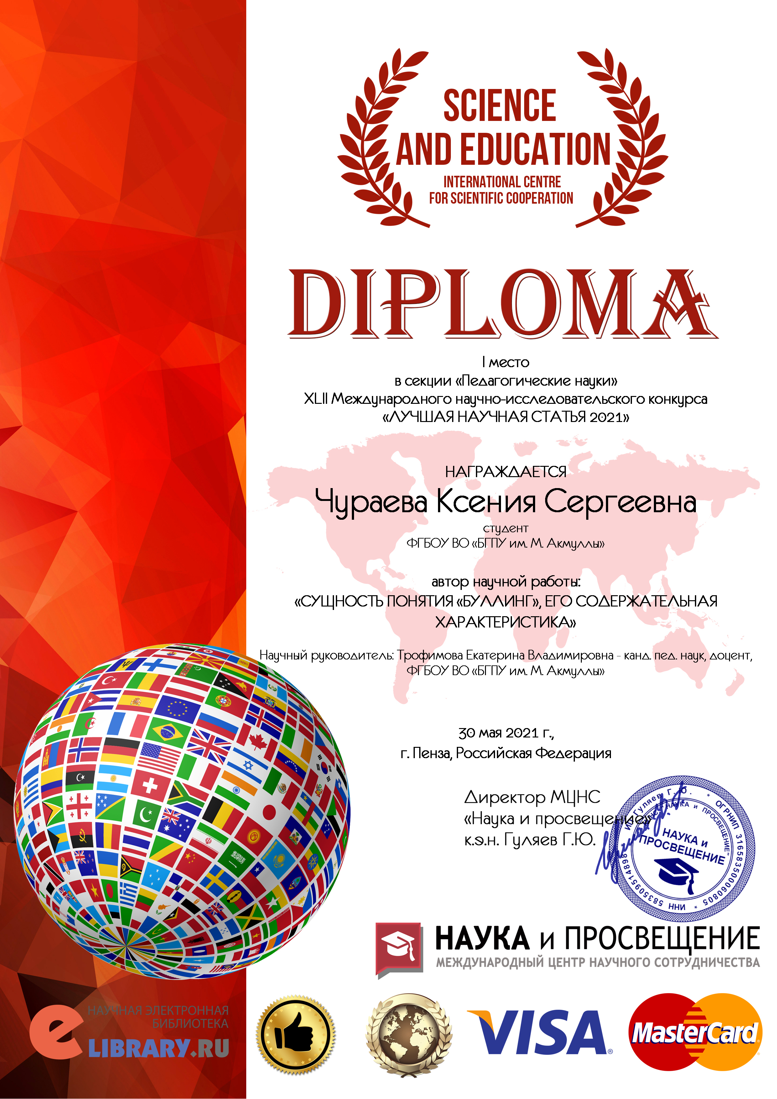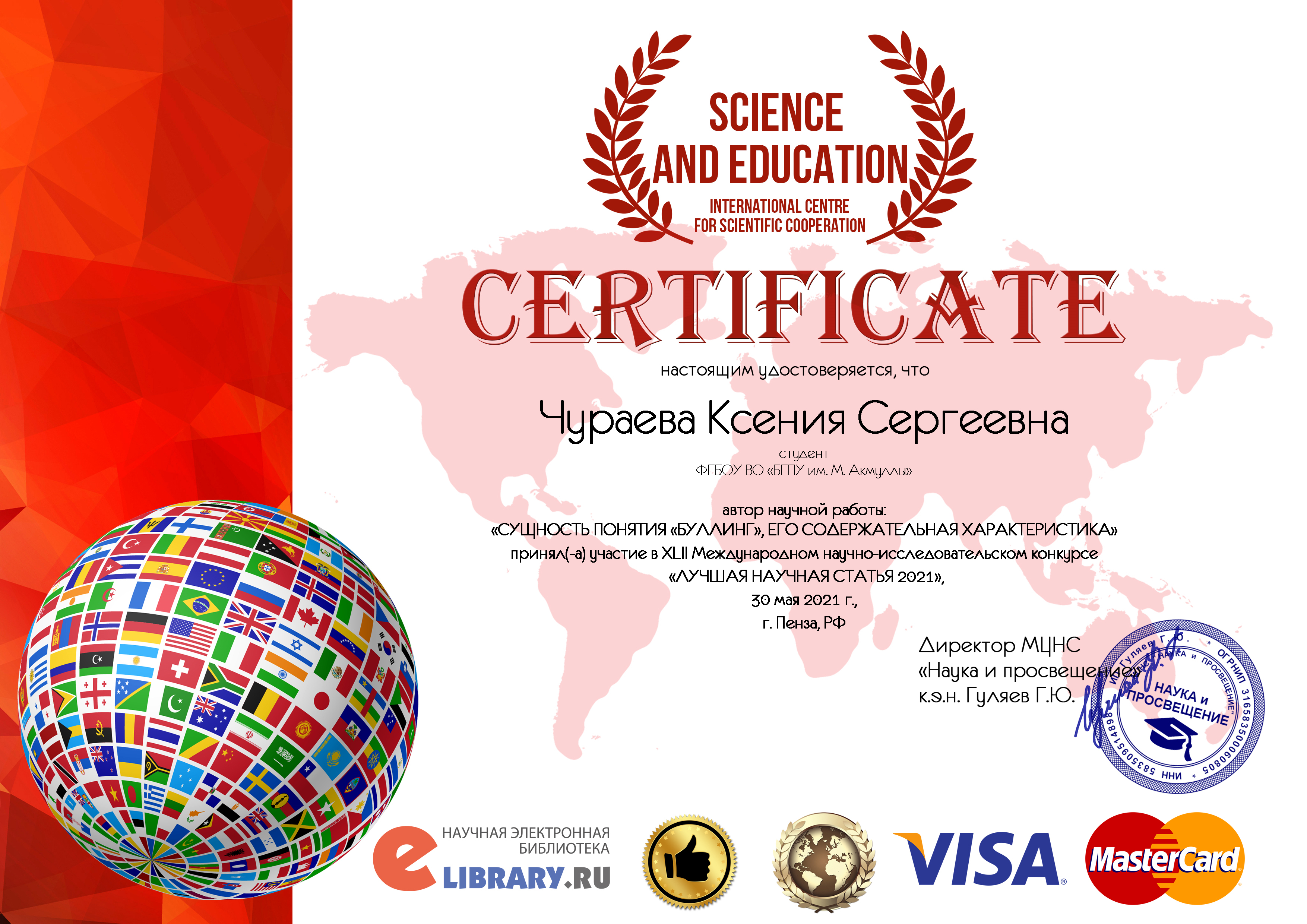 Чураева Ксения, студентка 4 курса Института педагогики, направление подготовки Психолого-педагогическое образование, профиль «Психология и социальная педагогика» приняла участие в XLII Международном научно-исследовательском конкурсе ЛУЧШАЯ НАУЧНАЯ СТАТЬЯ 2021, созданным с целью содействия эффективному развитию науки и инноваций, организованного Международным Центром Научного Сотрудничества «Наука и Просвещение».