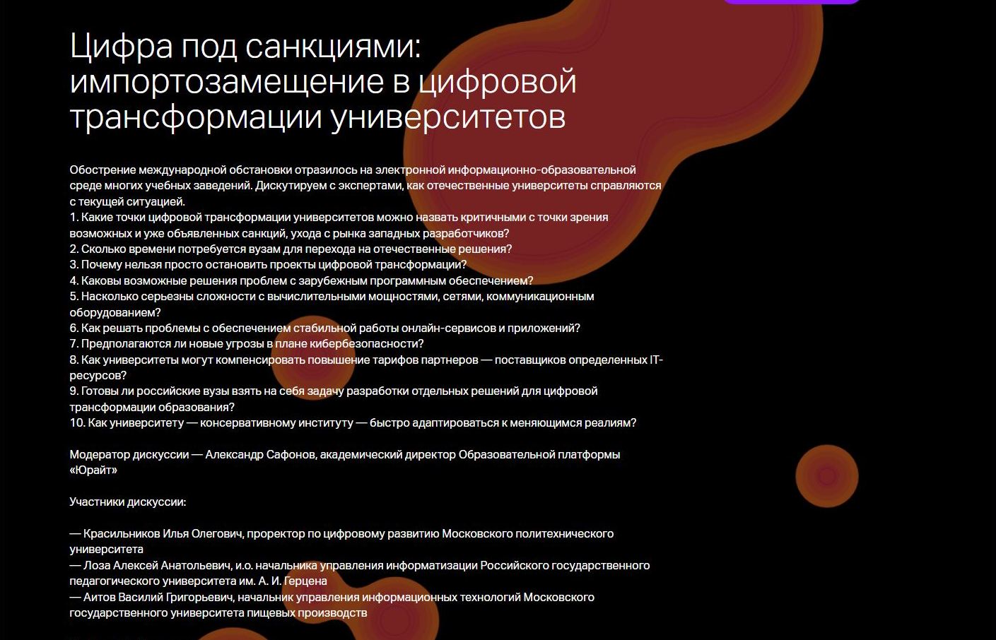 Модератором дискуссии выступил Александр Сафонов, академический директор Образовательной платформы «Юрайт». Участники дискуссии: Красильников Илья Олегович, проректор по цифровому развитию Московского политехнического университета; Лоза Алексей Анатольевич, и.о. начальника управления информатизации Российского государственного педагогического университета им.А.И.Герцена; Аитов Василий Григорьевич, начальник управления информационных технологий Московского государственного университета пищевых производств.
