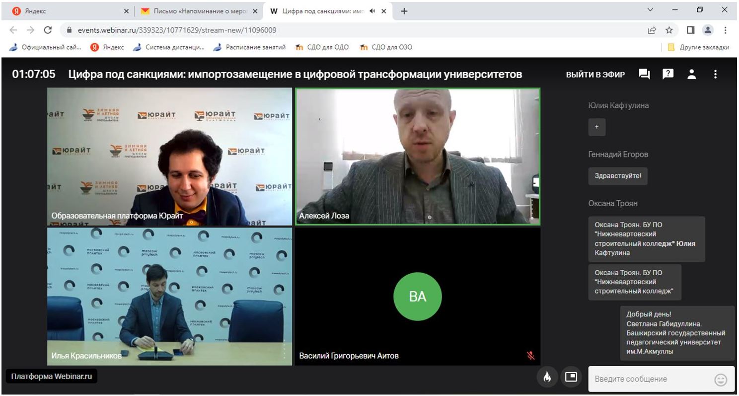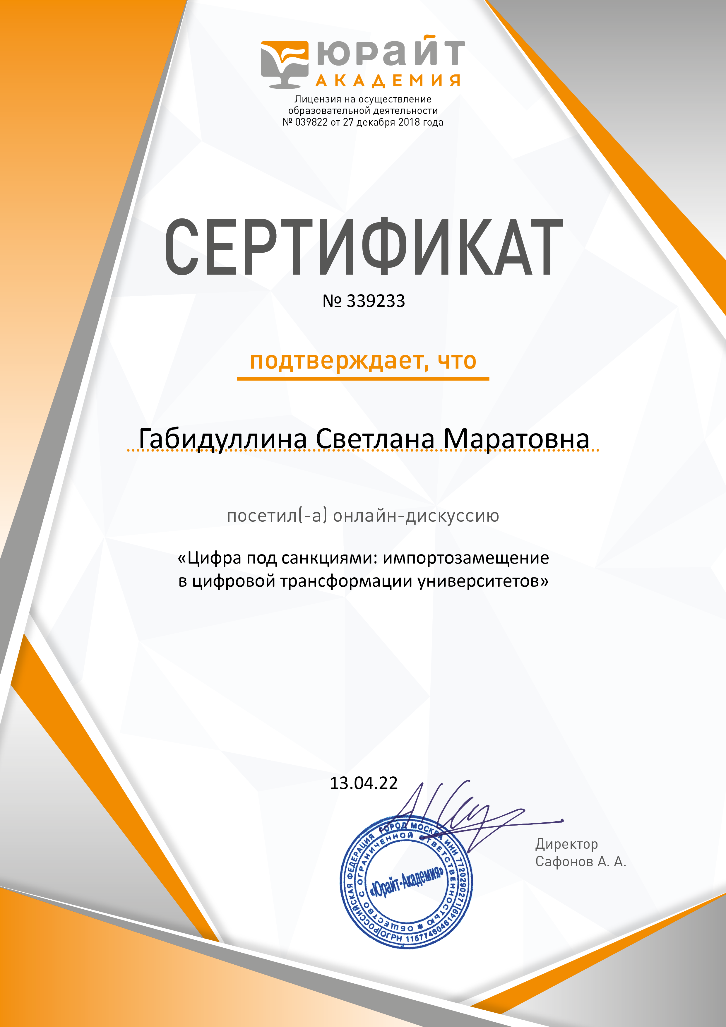 13 апреля 2022 года на базе Образовательной платформы «Юрайт» проводилась онлайн-дискуссия "Цифра под санкциями: импортозамещение в цифровой трансформации университетов". Старший преподаватель кафедры профессионального и социального образования, Габидуллина Светлана Маратовна, приняла участие в онлайн-дискуссии.