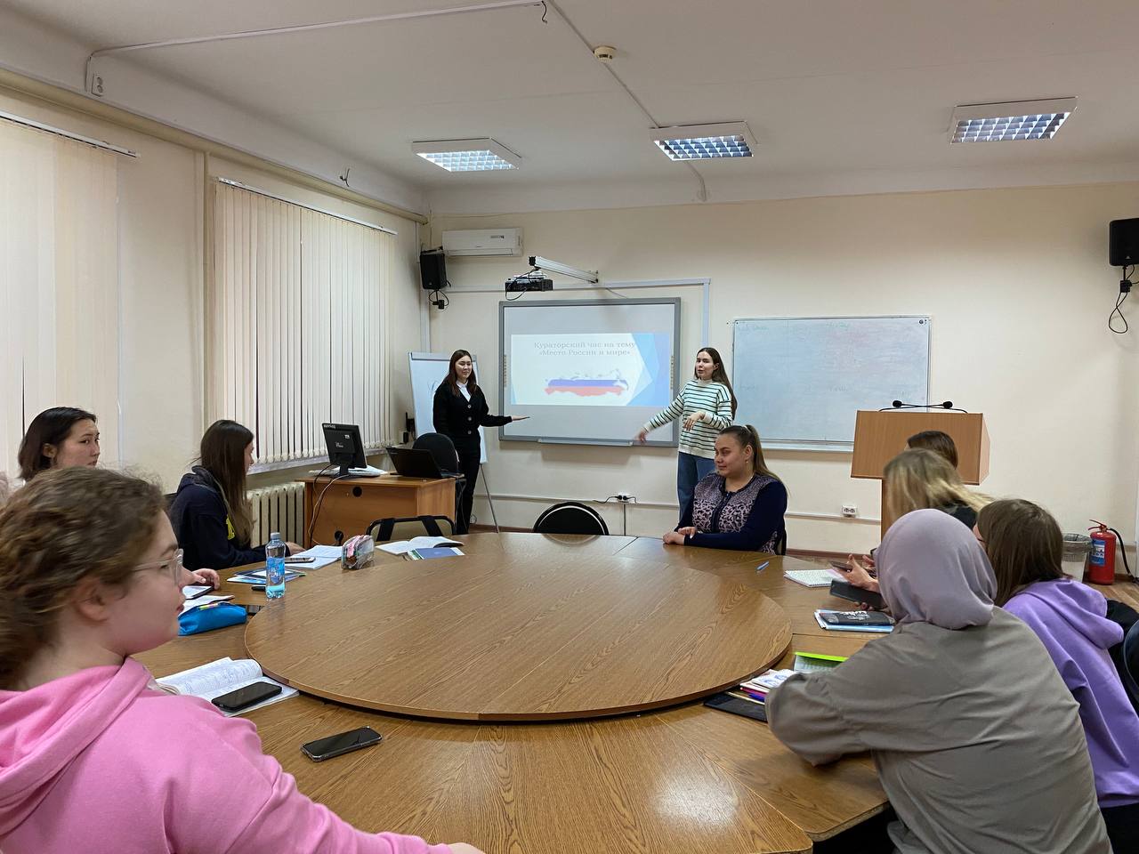 13 февраля 2023 года студентки 3 курса ППОСП 31-20, под руководством старосты группы Мухамадеевой Эльвины, Дыдычкина Екатерина и Ярметова Анна провели беседу с 1 курсом ППОСП 11-22, Габдульманова Ляйсан и Хикматуллина Гульназ провели беседу со 2 курсом ППОСП 21-21 на тему «Россия в мире».