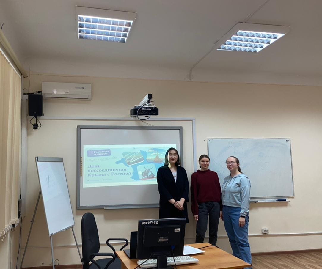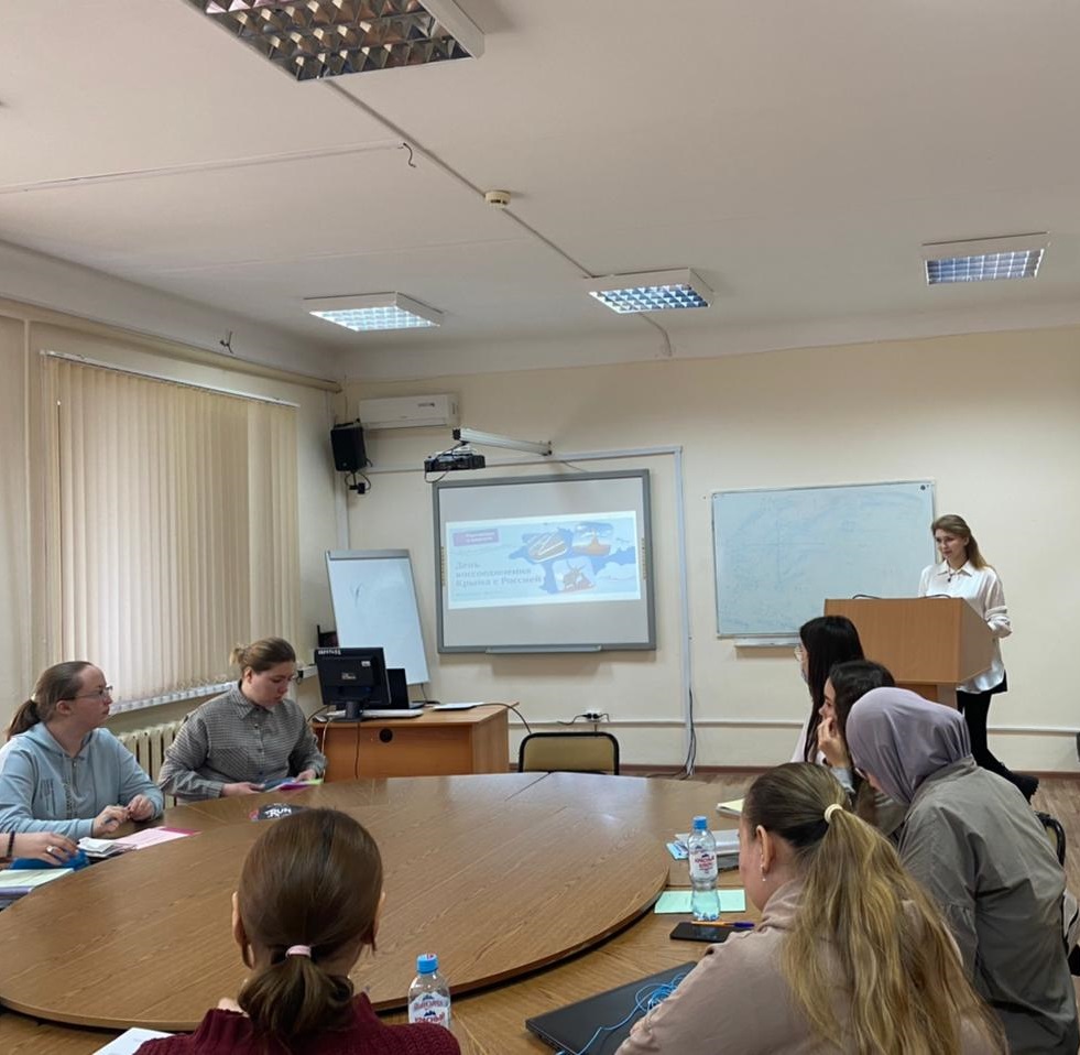 20 марта 2023 года студентки 4 курса направления подготовки 44.03.02 Психолого-педагогическое образование, направленность (профиль) «Психология и социальная педагогика» Абдеева Руфина и Попова Надежда провели беседу на тему «День воссоединения Крыма с Россией», которое входит в цикл внеурочной деятельности в рамках проекта "Разговоры о важном" со студентами 1 и 2 курсов.
