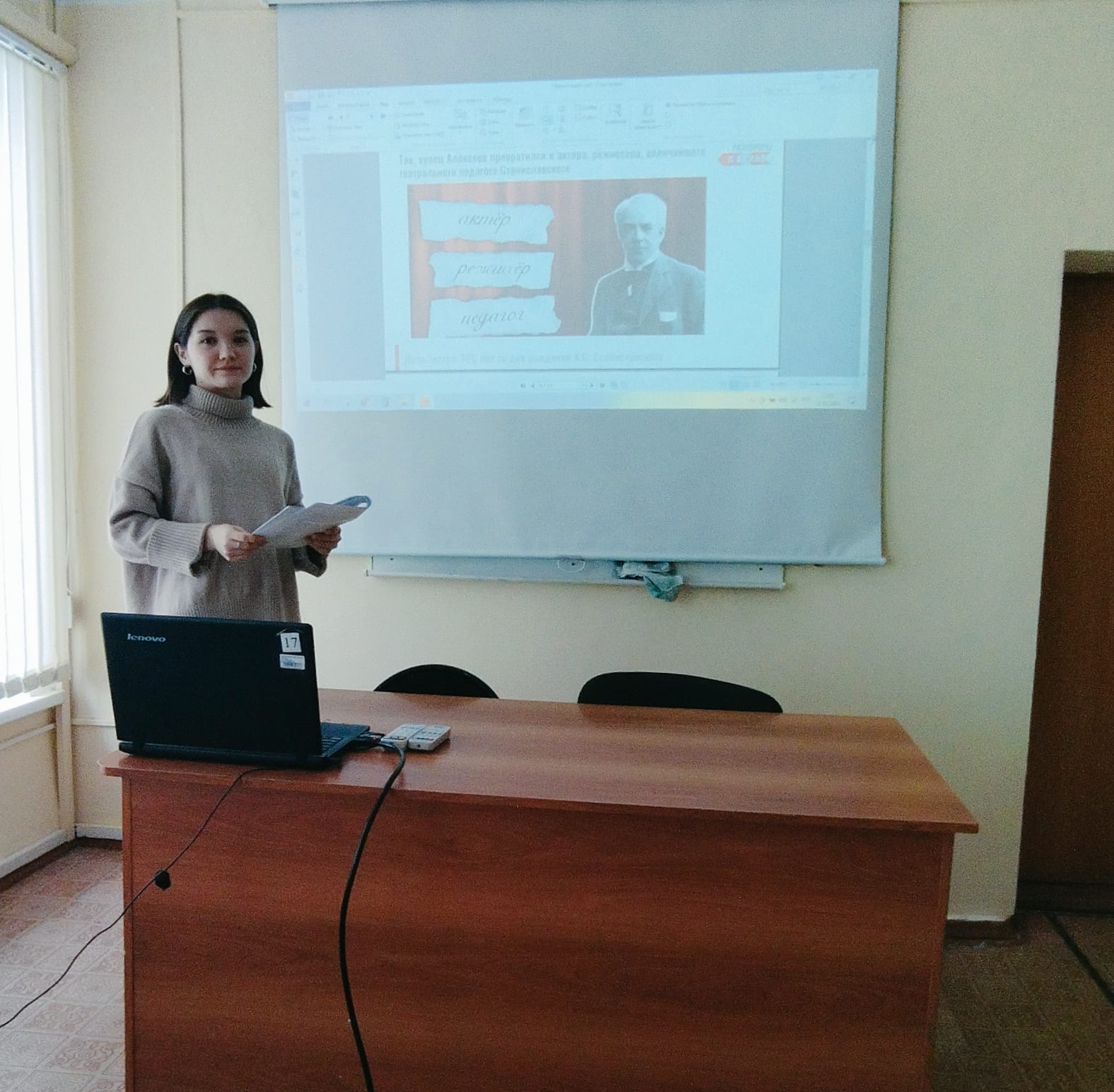 27 марта 2023 г. студентка 4 курса направления подготовки 39.03.02 – Социальная работа, направленность (профиль) «Социальная защита и социальное обслуживание семей и детей» Халикова Алина провела беседу со студентами первого курса направления подготовки 44.03.02 Психолого-педагогическое образование, направленность (профиль) «Психология и социальная педагогика» на тему «День театра. 160 лет со дня рождения К.С. Станиславского».
