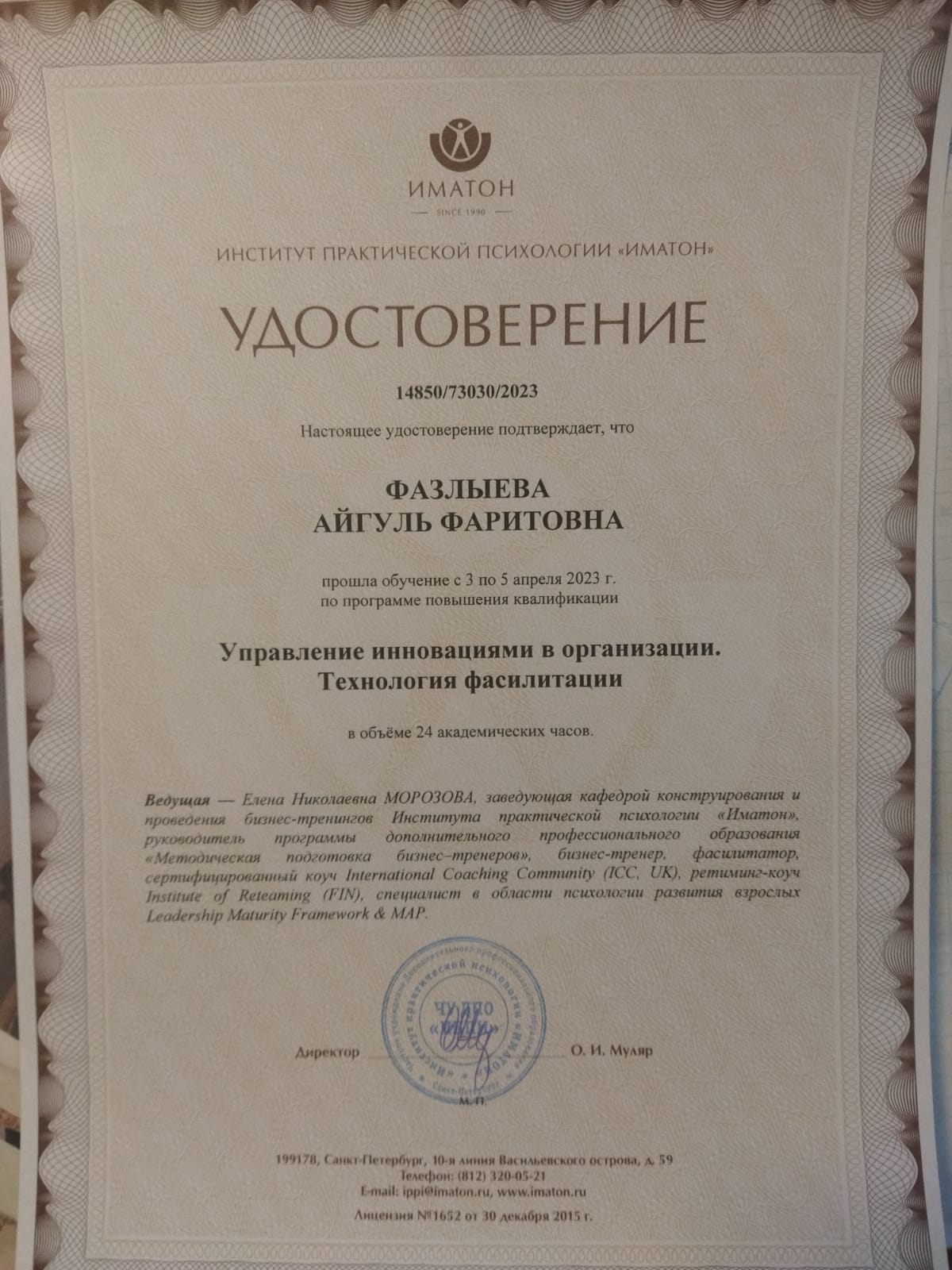 Доцент кафедры профессионального и социального образования Фазлыева А.Ф. прошла курсы повышения квалификации по программе «Управление инновациями в организации. Технология фасилитация» на базе Института практической психологии «Иматон».