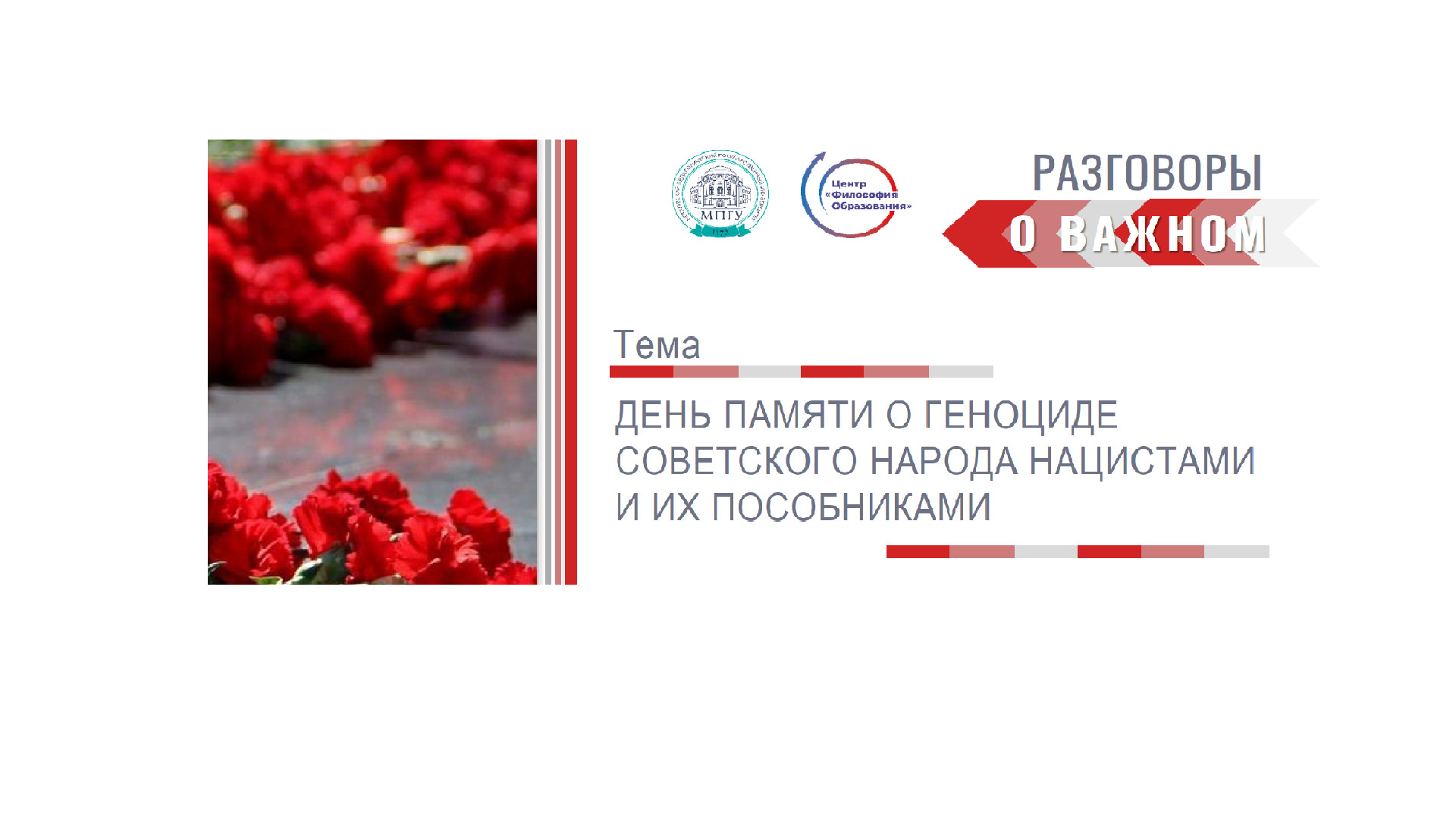 Цель беседы заключалась в формировании понимания необходимости сохранения исторической правды, памяти и преемственности поколений на примере истории геноцида мирных советских граждан со стороны нацистов и их пособников в годы Великой Отечественной войны 1941-1945 гг. Студенты познакомились с понятием "геноцид", фактами геноцида советского народа со стороны нацистов и их пособников в годы Великой Отечественной войны, а также с их морально-нравственной и исторической оценкой. Особый интерес студенты проявили в обсуждении вопроса об установке исторически значимых памятников и, в особенности, про мемориал на месте концлагеря "Красный". В завершении студенты смотрели ролик "Мы не забудем! Мы не допустим возрождение геноцида!".