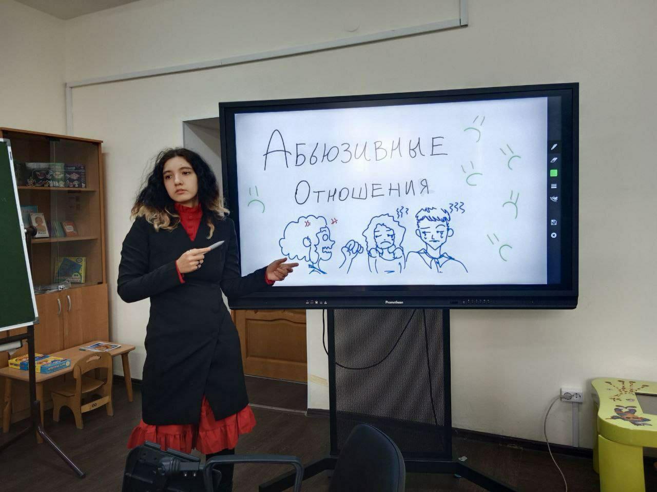 В начале занятия, с помощью интерактивной доски, группе были приведены и объяснены общие термины: признаки и типы абъюзивных отношений, а также причины становления абьюзера. На протяжение мероприятия велось живое обсуждение темы.