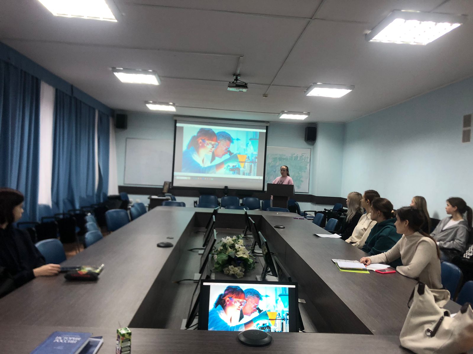 В начале мероприятия студенты отметили, что Россия- огромная и многонациональная страна. Она известна открытиями ученых в различных областях науки и технологий, которые не однократно становились точкой отсчета для дальнейших изысканий и исследований. Студентам было предложено перечислить достижения российских ученых. Они вспомнили таких деятелей, как Менделеев Д.И., Ломоносов М.В. и Пирогов Н.И., а также их достижения.