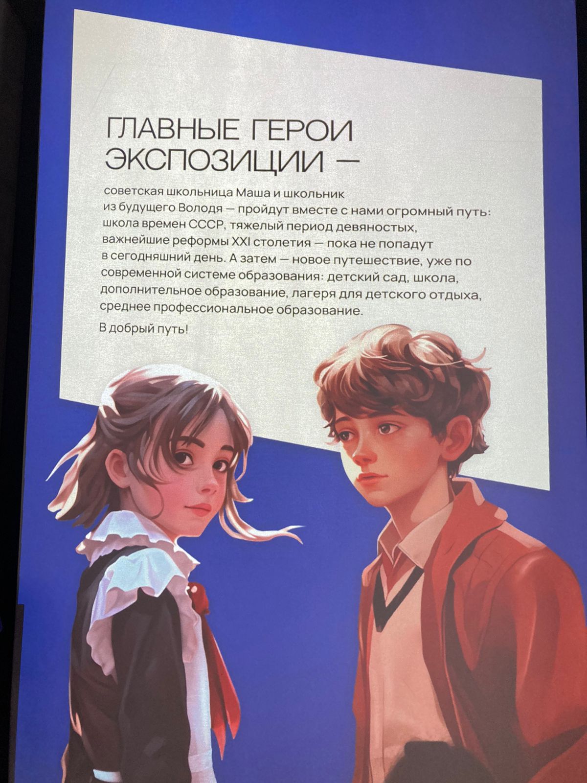 Студенты кафедры профессионального и социального образования, обучающиеся по направлению Социальная работа, направленность (профильная) «Социальная защита и социальное обслуживание семей и детей» посетили торжественное открытие данной выставки. Им удалось погрузиться в  иммерсивное путешествие из прошлого в настоящее и будущее системы отечественного образования в сопровождении главных героев экспозиции – девочки Маши из настоящего и мальчика Вовы из будущего.