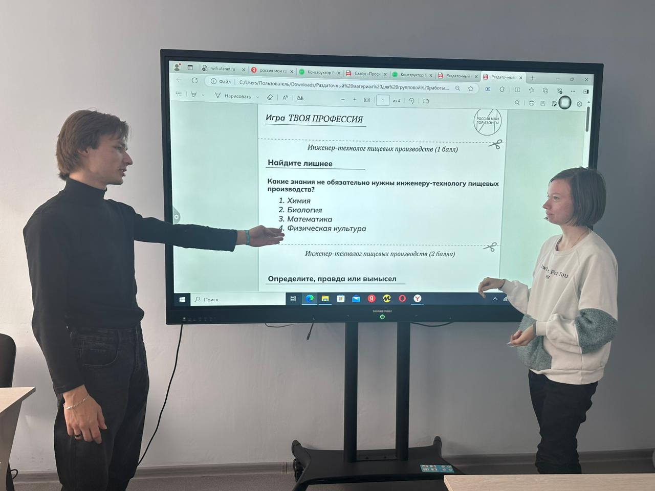 Сегодня, 17 октября 2024 года, в рамках просветительских мероприятий Всероссийского проекта «Россия – мои горизонты» для студентов, обучающихся по направлению Социальная работа, направленность (профиль) Социальная защита и социальное обслуживание семей и детей было проведено профориентационное занятие "Россия аграрная: пищевая промышленность и общественное питание" под руководством старшего преподавателя кафедры О.В. Вечкановой, тьютора института педагогики Гавриковой В.В.