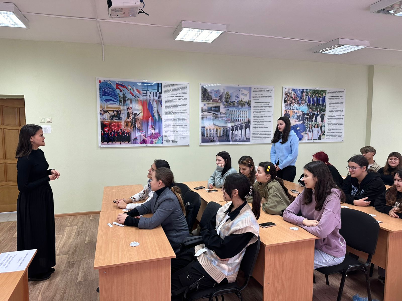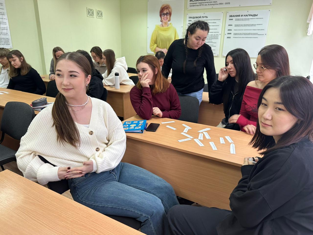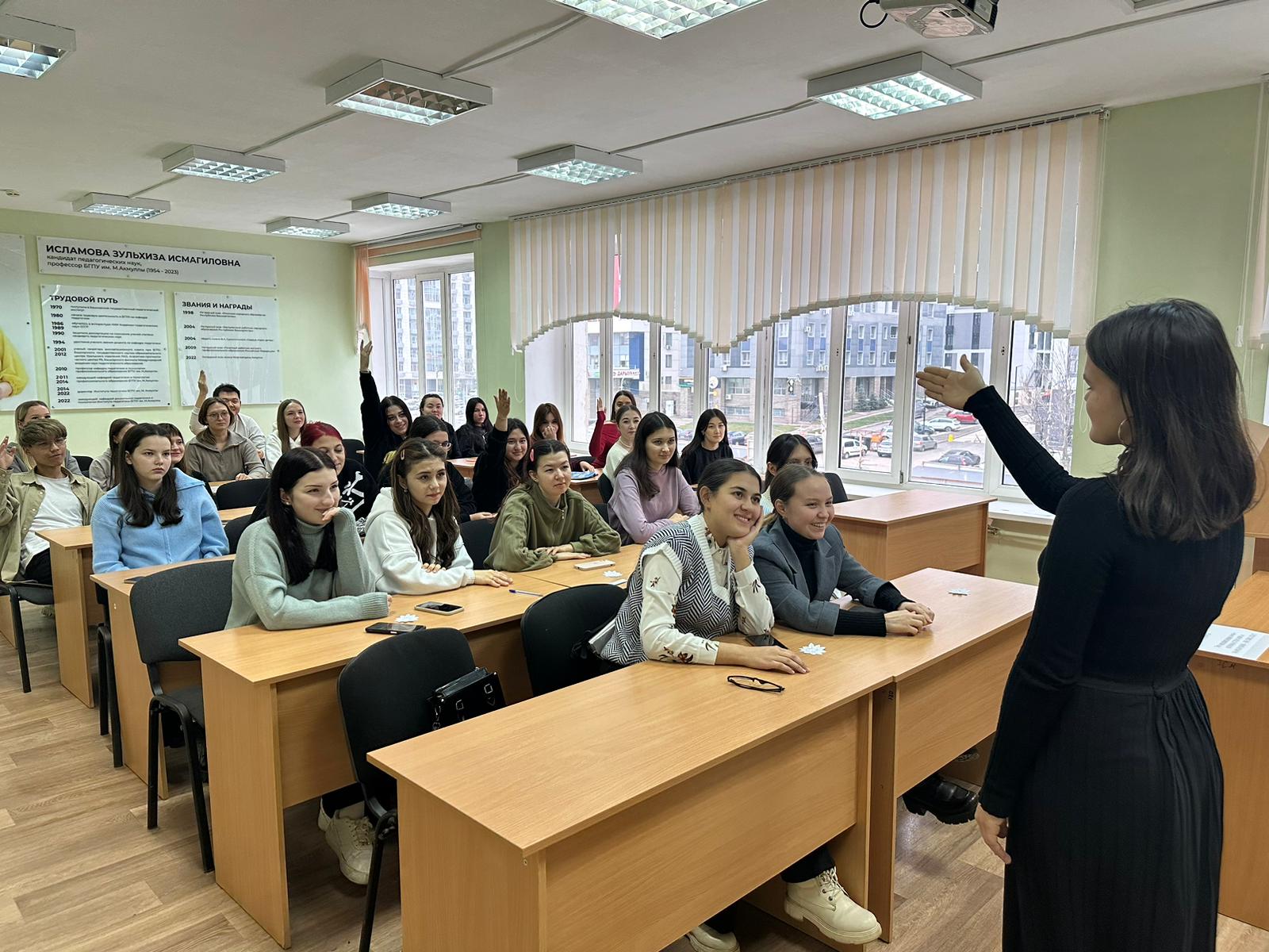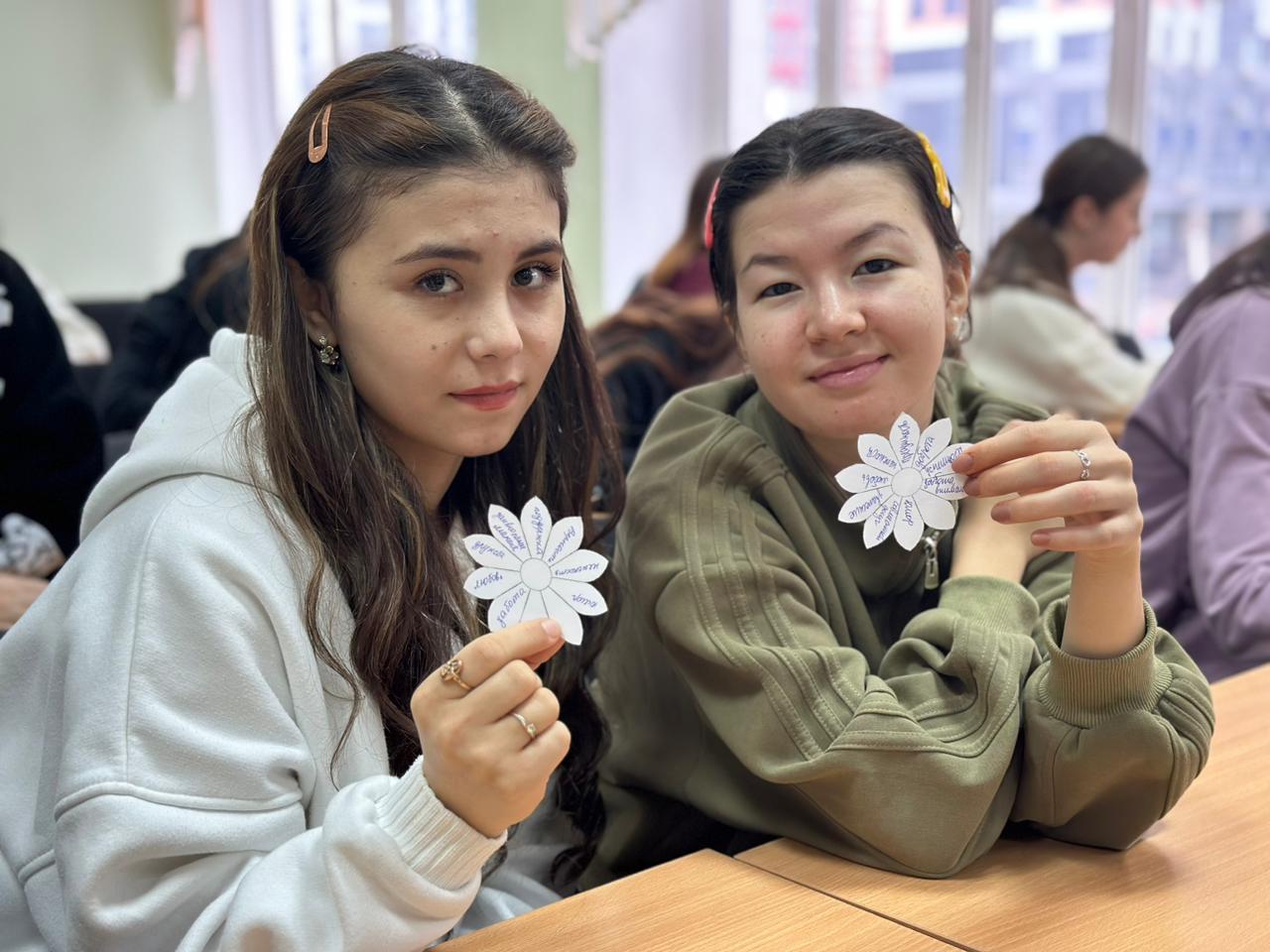 Затем студентка 3 курса направления подготовки Психолого-педагогическое образование направленность (профиль) Психология и социальная педагогика Гафурова Азалия провела практическое задание по теме лекции. Студенты работали с ромашками, на лепестках которых вписывали те ценности, которые они считают важными для своих будущих семей. Каждый лепесток стал отражением надежд и стремлений студентов, а их идеи и мнения создали атмосферу доверия.