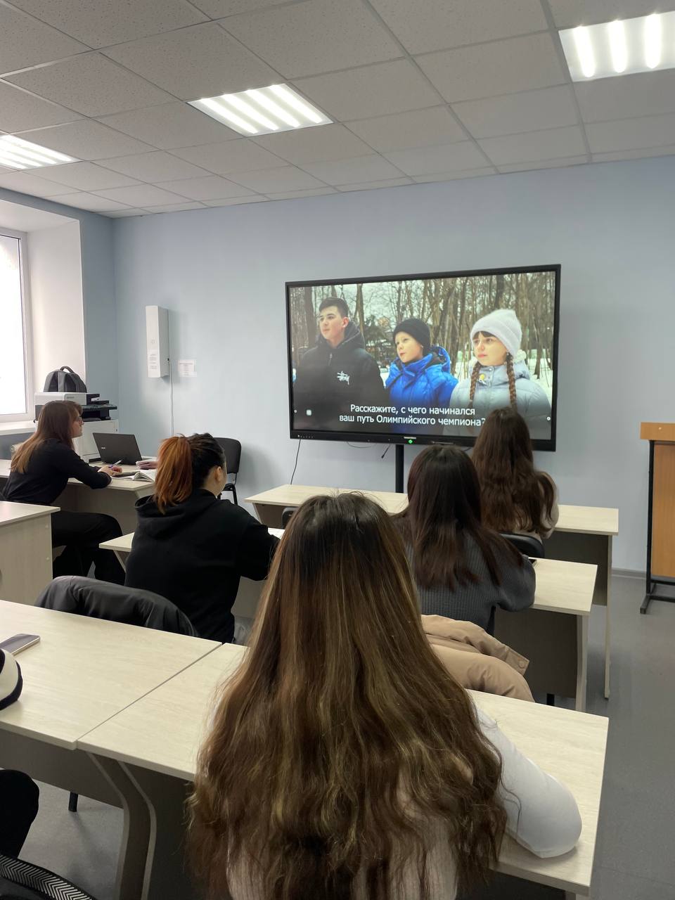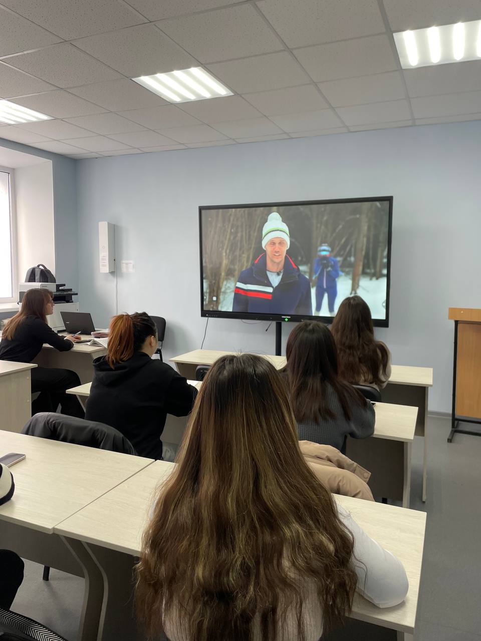 После этого мы посмотрели интервью с олимпийским чемпионом и трехкратным чемпионом мира по лыжным гонкам Никитой Крюковым. Его слова о важности упорства и веры в себя оказали сильное влияние на студентов.