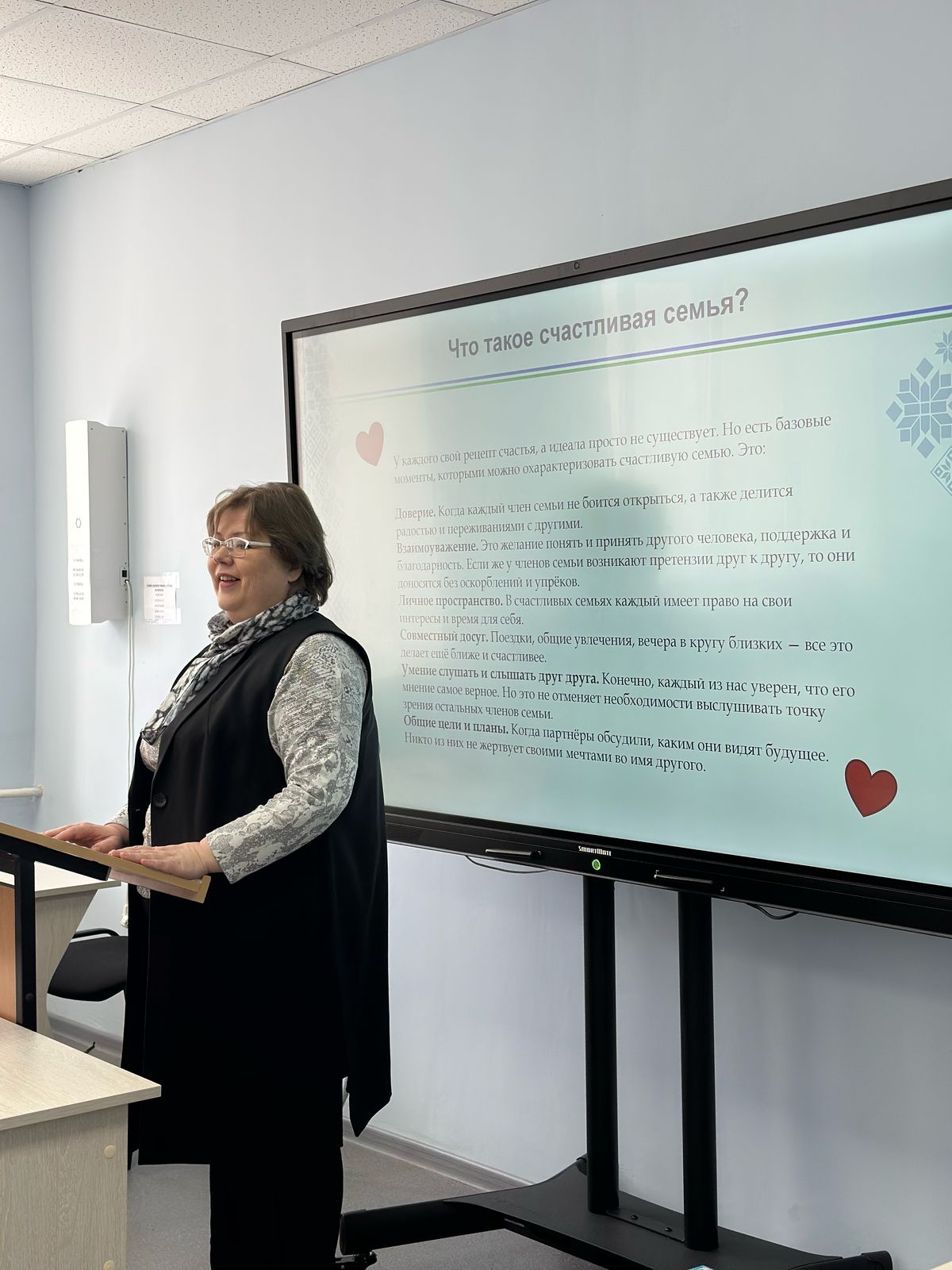 Спикером встречи выступила кандидат педагогических наук, доцент Трофимова Е.В., которая поделилась своим опытом и знаниями о том, что такое счастливая семья и каковы ее ключевые характеристики. В ходе обсуждения студенты узнали, что счастливый родитель — это не тот, кто стремится к идеалу, а тот, кто понимает, что несовершенство — это нормально. Е.В. Трофимова акцентировала внимание на том, что важно быть искренним и заботливым, а также уметь управлять стрессом в повседневной жизни.