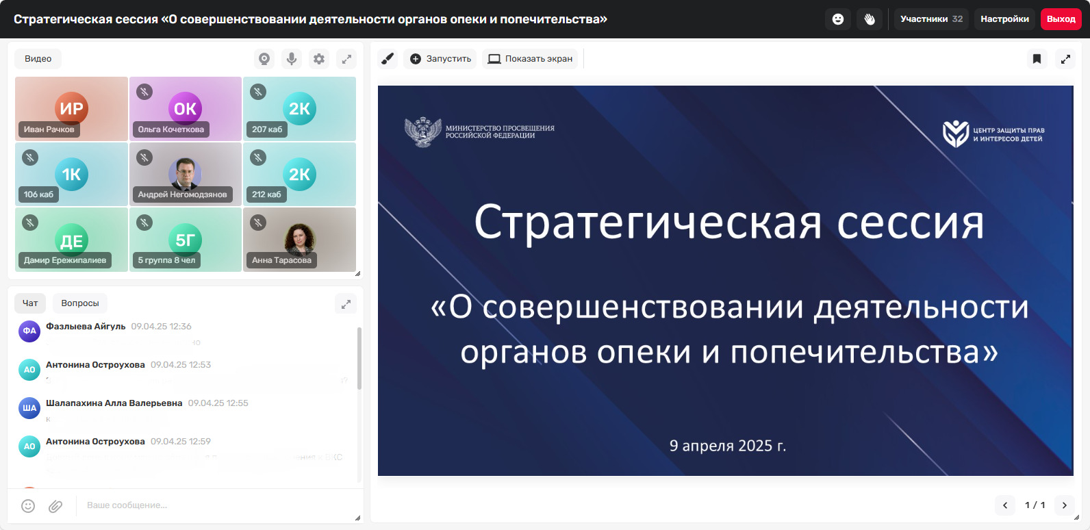 9 апреля 2025 г. доцент кафедры профессионального и социального образования А.Ф. Фазлыева приняла участие в стратегической сессии, организованной Министерством просвещения Российской Федерации и посвященной развитию системы деятельности органов опеки и попечительства и учреждений для детей-сирот.