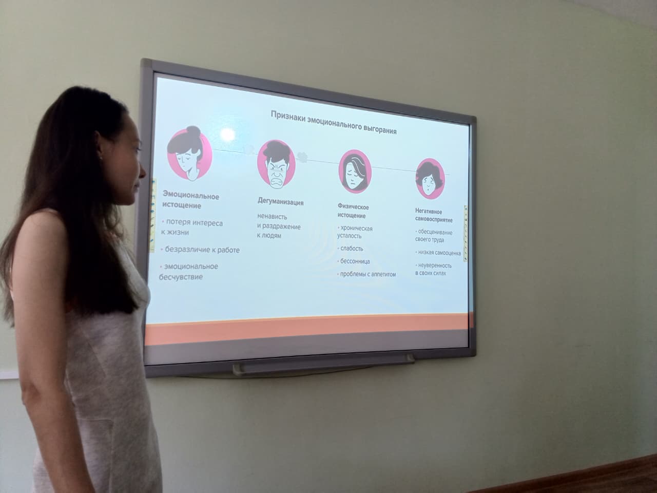 В начале встречи были освещены основные стадии эмоционального выгорания, какими чувствами они сопровождаются, какое поведение характерно человеку на каждой стадии и что нужно делать, чтобы вовремя распознать у себя первые «красные флаги» выгорания. Участники обсудили, что данная проблема является актуальной для людей любого возраста, особенно в век развития инноваций и глобальной информатизации населения.