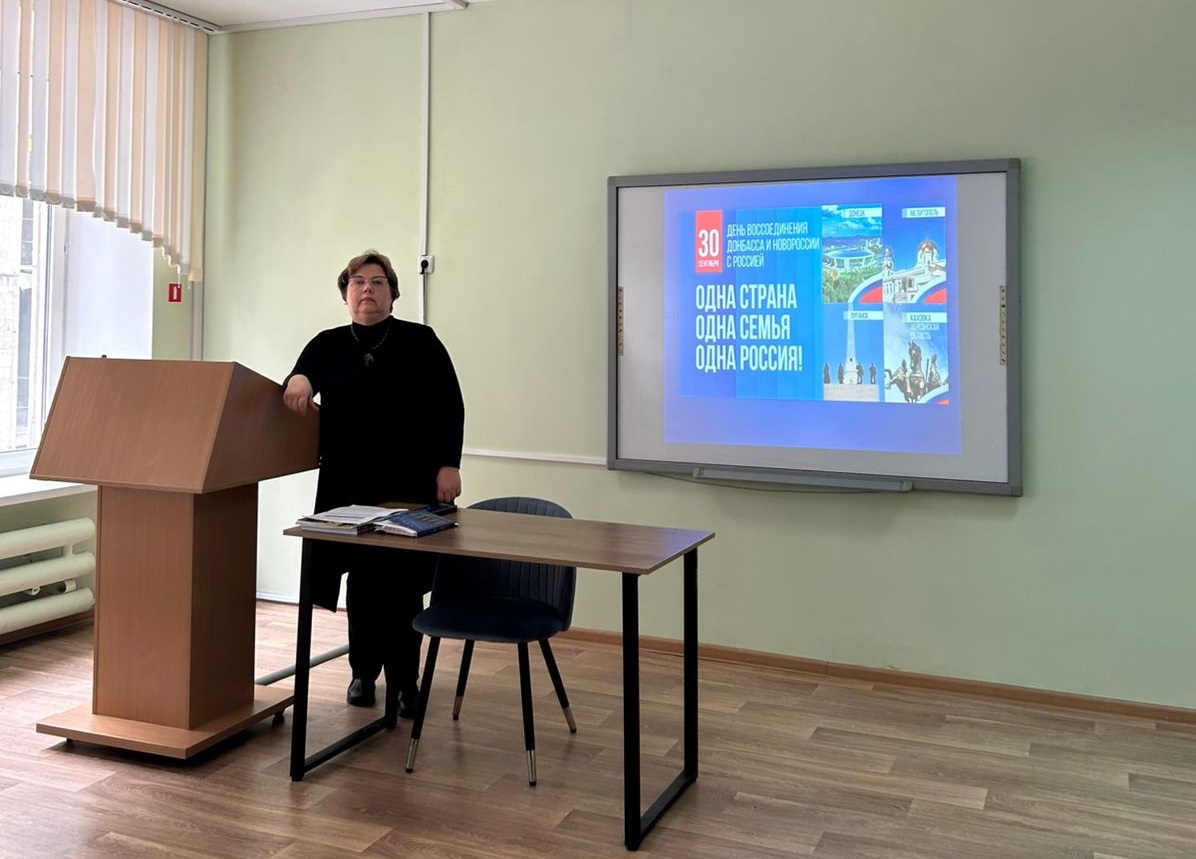 В ходе просветительской лекции студенты узнали, что    территории современных Донецкой, Луганской, Херсонской и Запорожской областей исторически входили в состав Российской империи и были известны как Новороссия. Их активное заселение и развитие происходило в тесной связи с центральными регионами России.  В 1922 году эти земли вошли в состав Украинской Советской Социалистической Республики в рамках СССР. Это было административное деление внутри единого государства, где границы между республиками не имели значения государственных.  После распада Советского Союза в 1991 году административные границы между союзными республиками неожиданно превратились в государственные. Миллионы русских и русскоязычных людей оказались за пределами своей исторической Родины, в новом государстве, где начался процесс насильственной украинизации и пересмотра общей истории. Свержение легитимной власти на Украине в 2014 году стало переломным моментом. Новые власти взяли курс на жесткую дискриминацию русскоязычного населения, запрет русского языка, героизацию националистических формирований.  В ответ на эти действия жители Донецкой и Луганской областей, стремясь защитить свои права, язык и культуру, провели референдумы о самоопределении и провозгласили независимые народные республики. Киев ответил на это силой, развязав полномасштабные боевые действия. Восемь лет Донбасс жил под обстрелами, тысячи мирных жителей погибли.   К 2022 году наступление Украины на Донбасс и ее заявления о возможном вступлении в НАТО создали прямую угрозу национальной безопасности России. Размещение войск НАТО в непосредственной близости от Ростова-на-Дону и Крыма было неприемлемо.  В сентябре 2022 года на освобожденных территориях Донецкой, Луганской, Херсонской и Запорожской областей были проведены референдумы о вхождении в состав Российской Федерации. За это проголосовало подавляющее большинство жителей. 30 сентября 2022 года Президент России В.В. Путин подписал договоры о принятии четырех новых субъектов в состав РФ. Эти договоры были ратифицированы Конституционным судом, а затем обеими палатами Федерального Собрания – Государственной Думой и Советом Федерации. С точки зрения официальной позиции Российской Федерации, эти действия были направлены на укрепление мира.  Вхождение этих территорий в состав России положило конец восьмилетнему обстрелу городов Донбасса. Теперь они защищены российской армией.  Присоединение отодвинуло линию фронта от жизненно важных центров России и Крыма, что способствует стратегической стабильности. Россия взяла на себя ответственность за защиту миллионов людей, которые хотели оставаться частью русского культурного и исторического пространства.