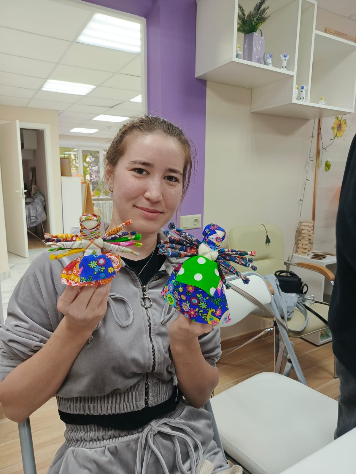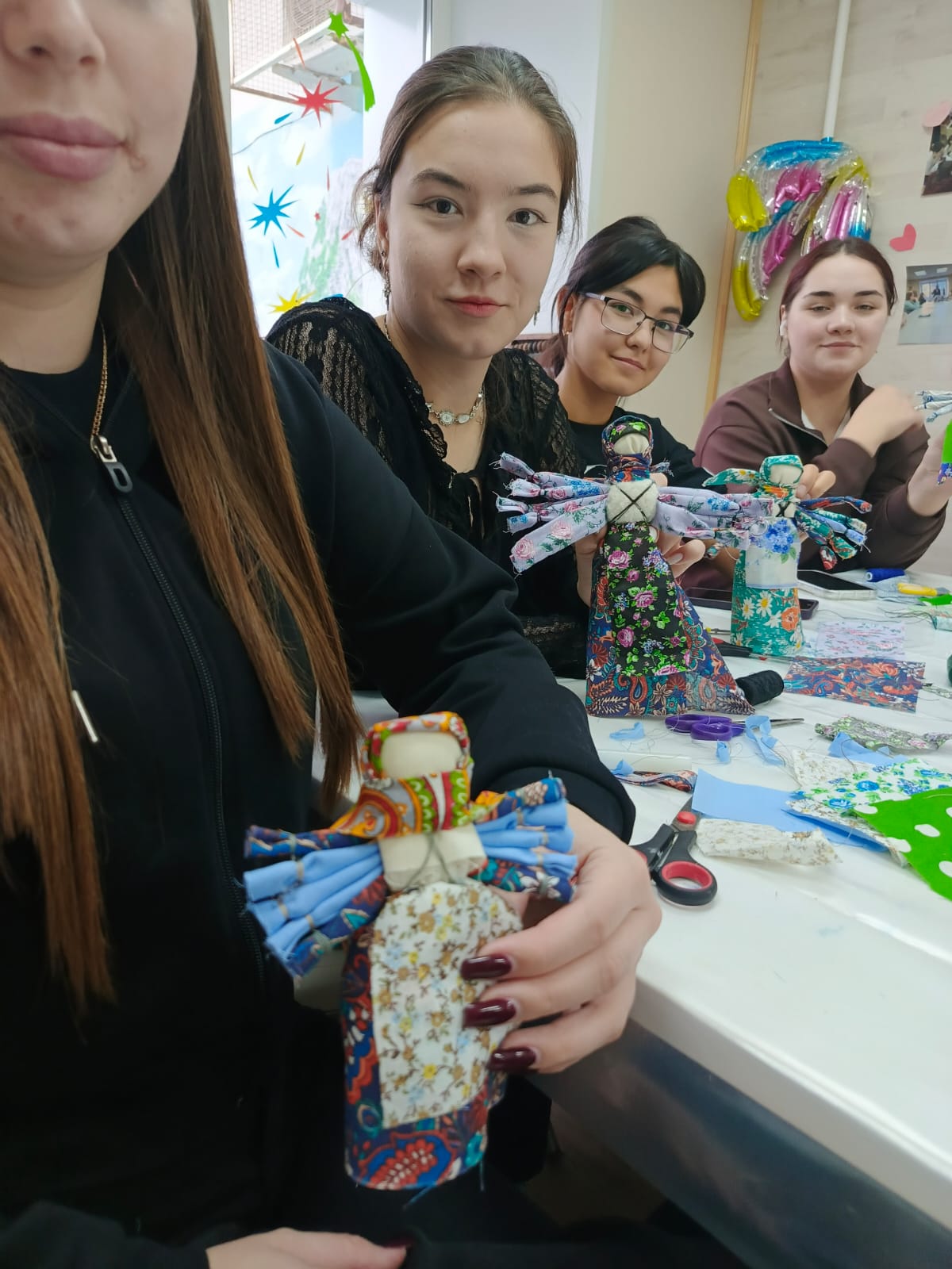 Главным событием стала практическая часть — создание традиционной народной куклы-оберега Десятиручки. Эта кукла, как гласит поверье, помогала хозяйке во всех делах: рукоделии, готовке, уборке и заботе о семье. Десять рук символизируют помощь в десяти главных женских делах, чтобы все спорилось и успевалось.