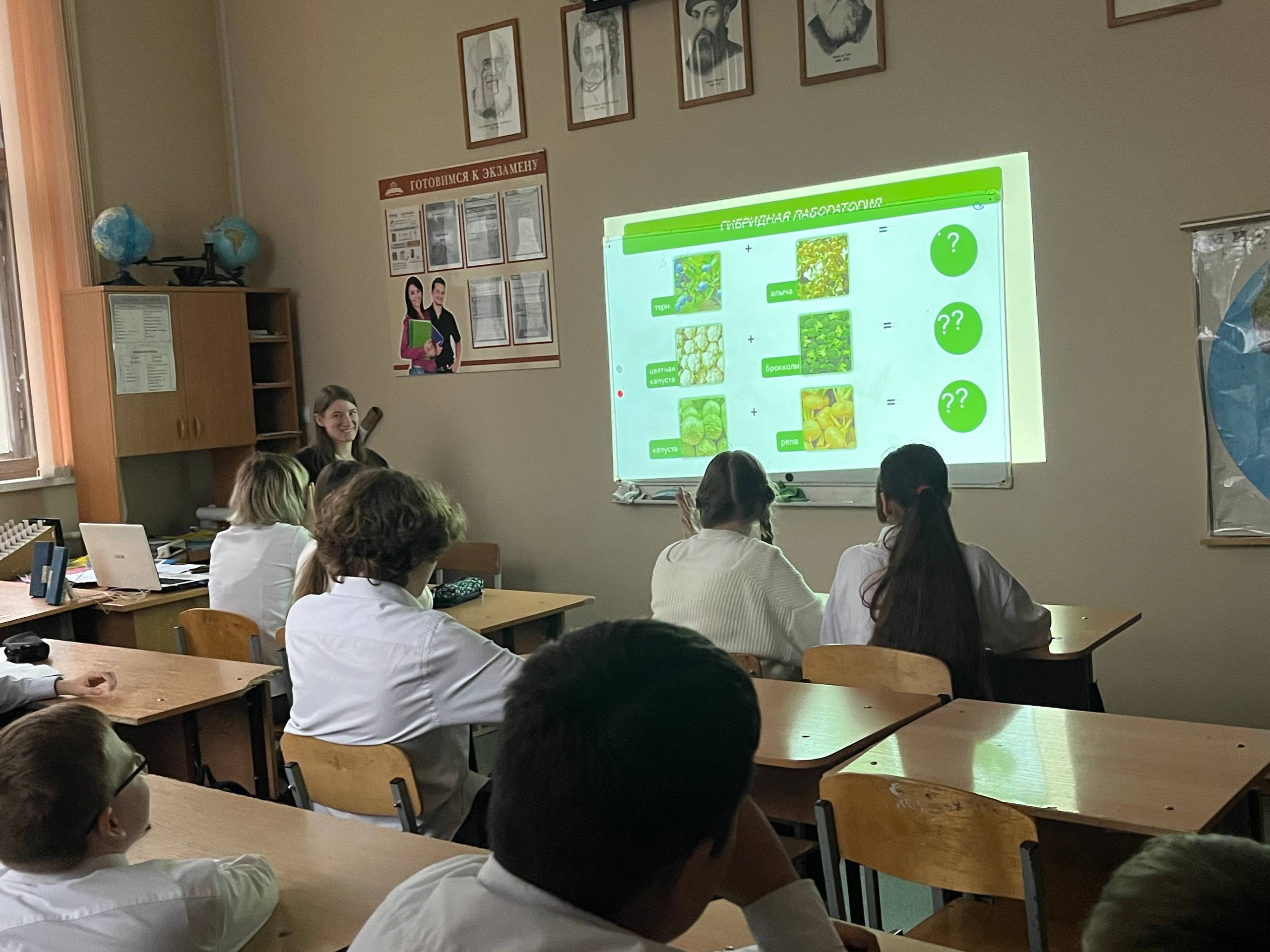 Теоретическая часть плавно перетекла в увлекательную практику. Для закрепления материала студенты провели интерактивную игру. Школьникам предлагалось пофантазировать и представить, что получится, если скрестить различные фрукты и овощи. Ребята с большим энтузиазмом включались в дискуссию, предлагали свои варианты и с интересом угадывали результаты известных селекционных экспериментов.