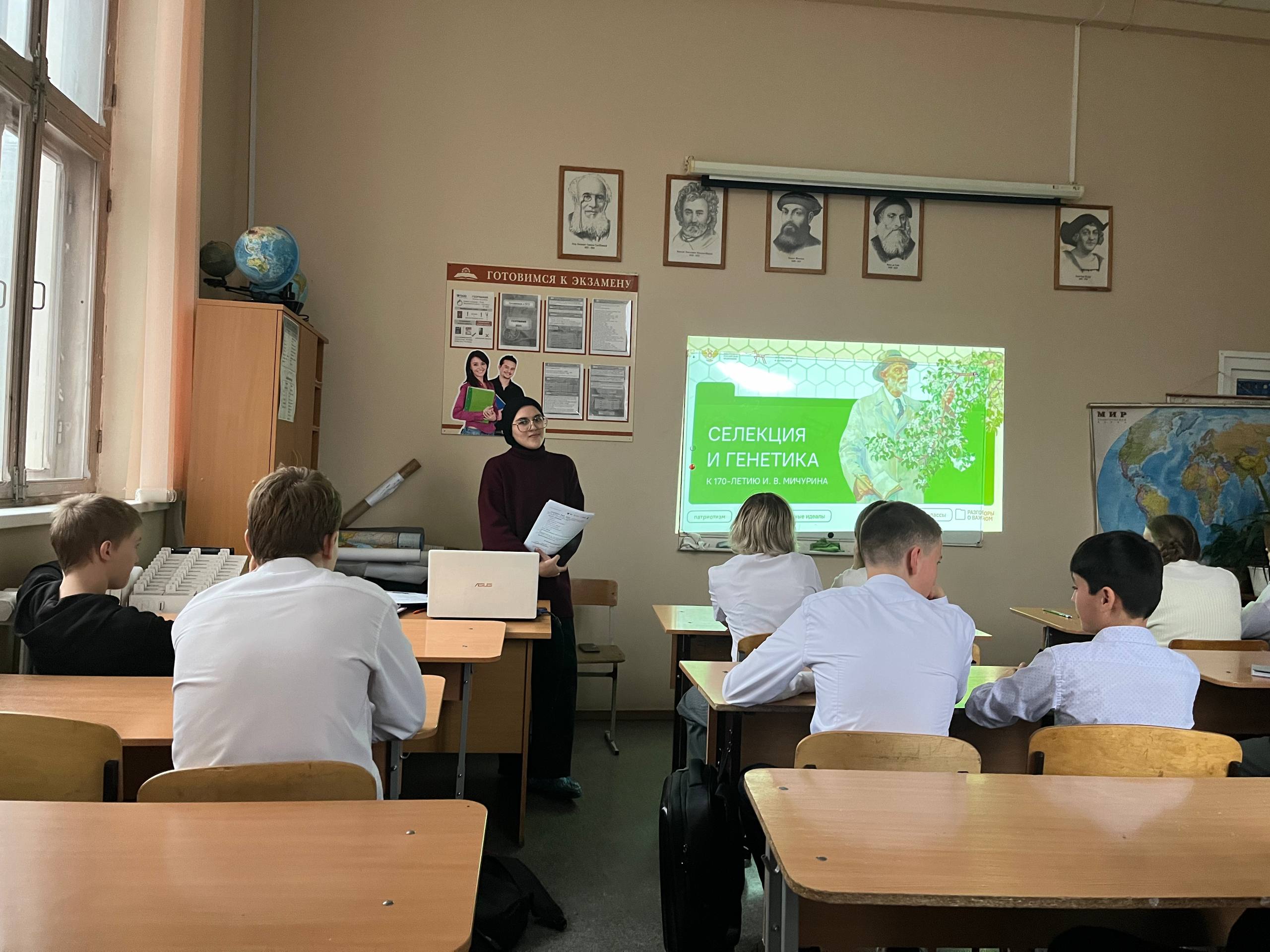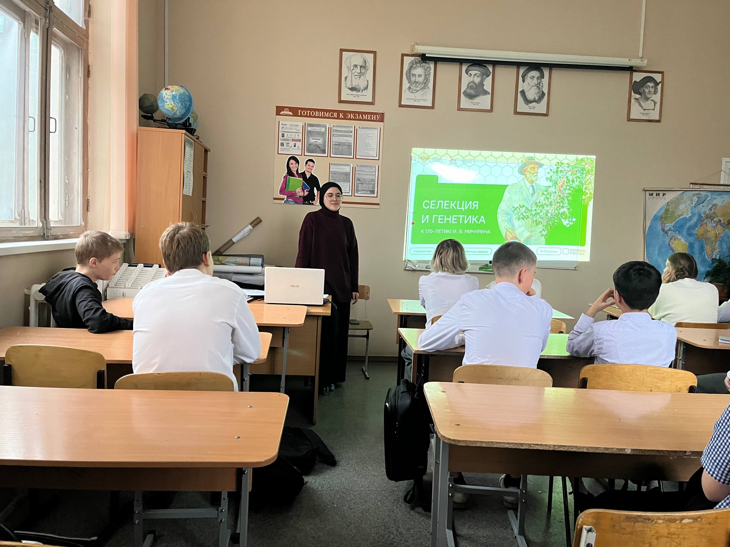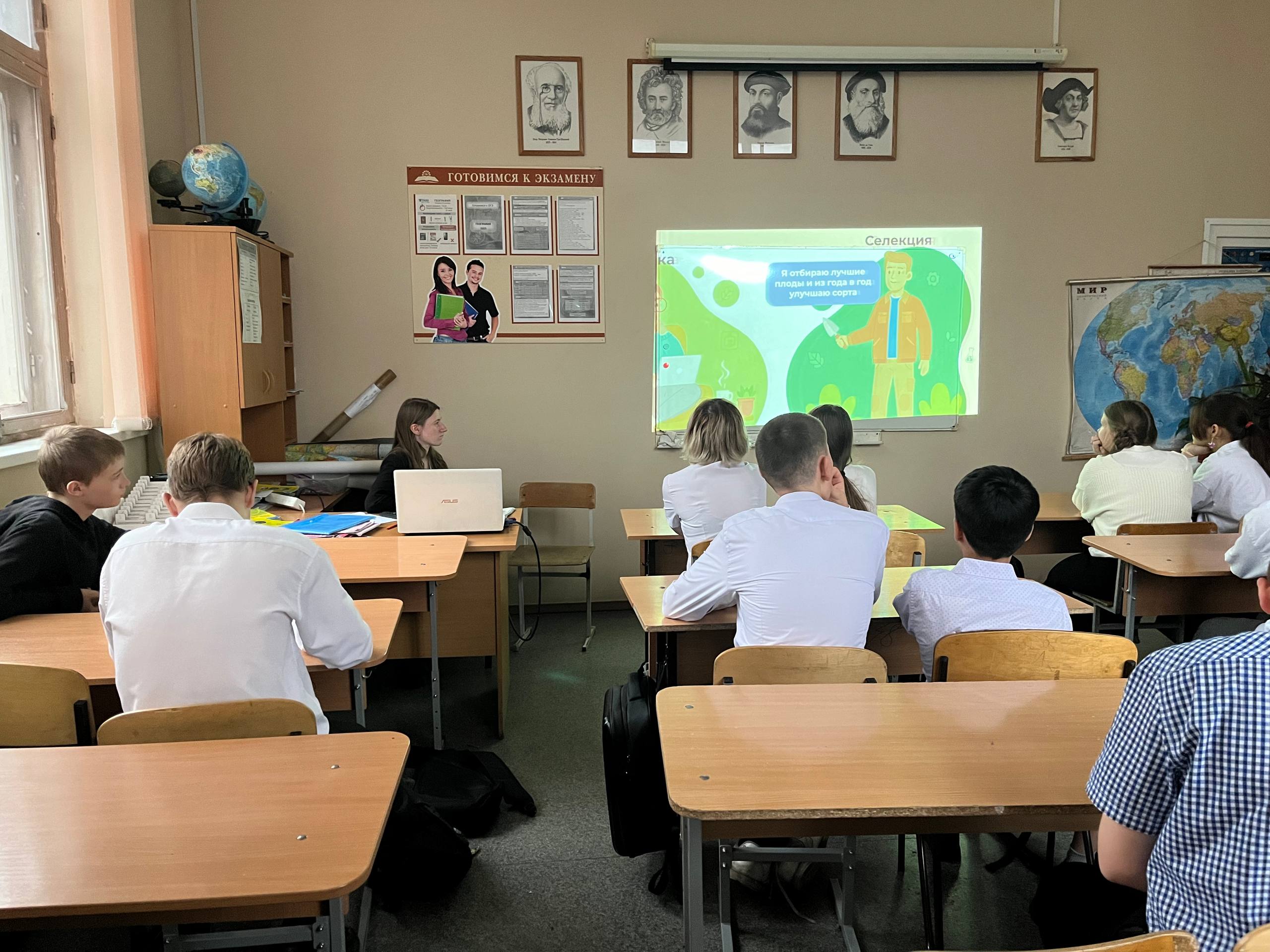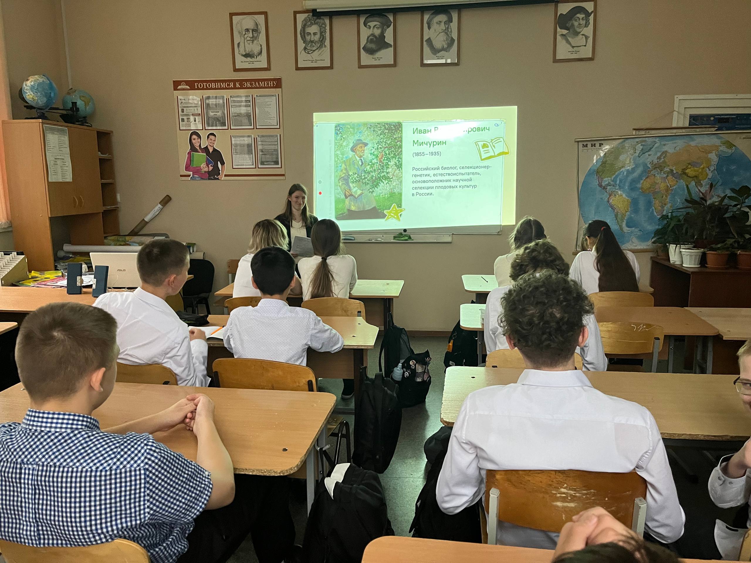 В начале занятия студенты познакомили школьников с историей селекции и рассказали о знаменитых ученых, чьи труды преобразили сельское хозяйство. Особое внимание было уделено Ивану Владимировичу Мичурину — одному из самых известных селекционеров-практиков в России, чьи работы по выведению новых сортов плодово-ягодных культур получили признание.