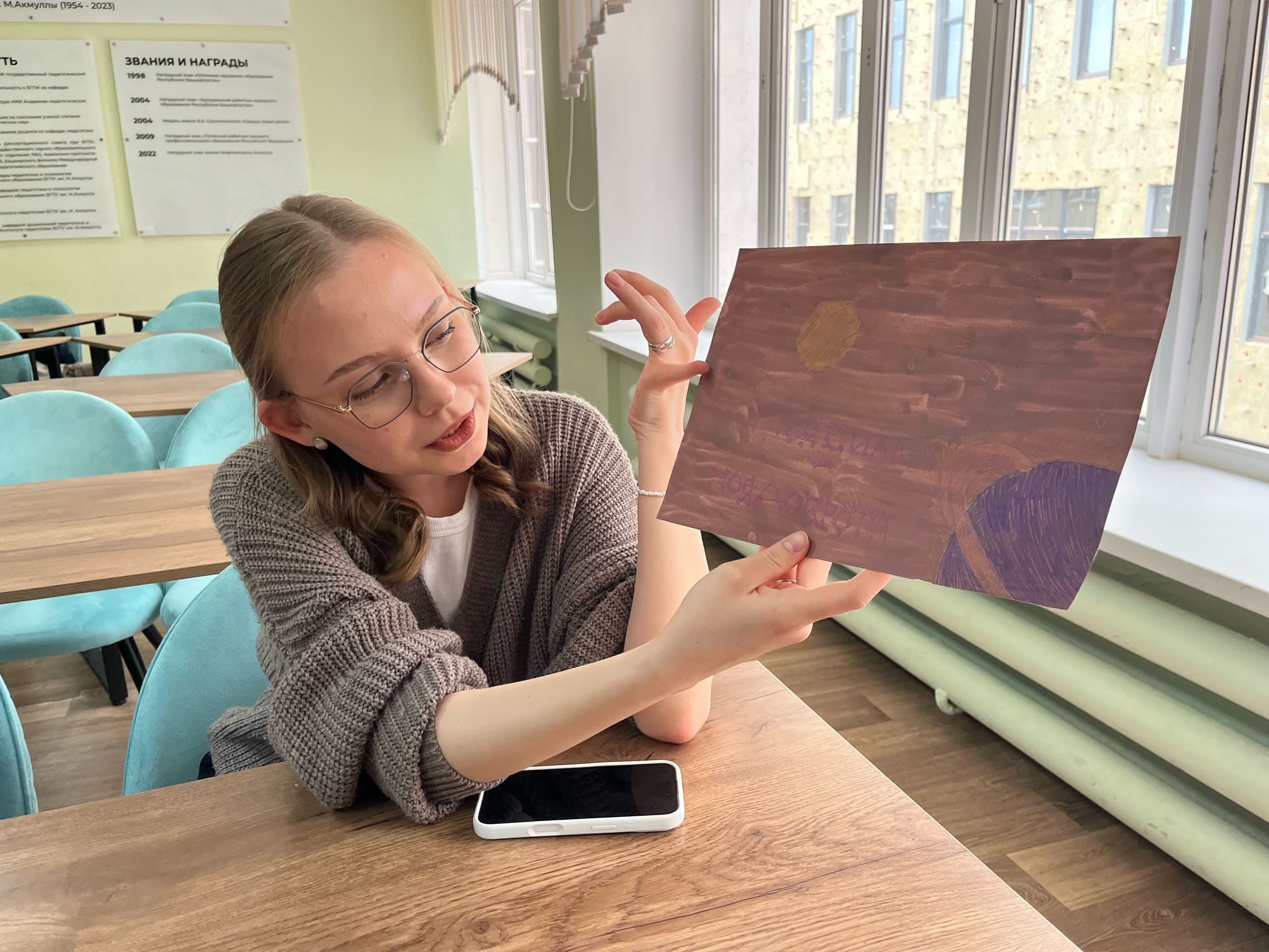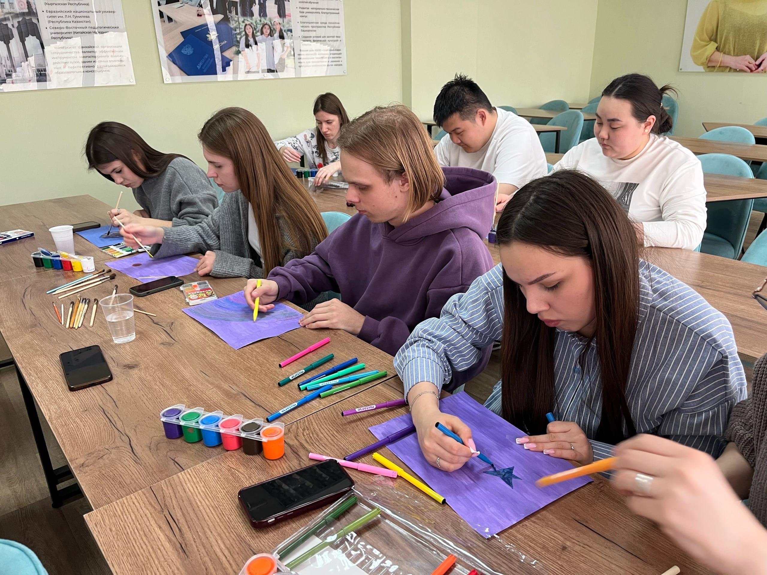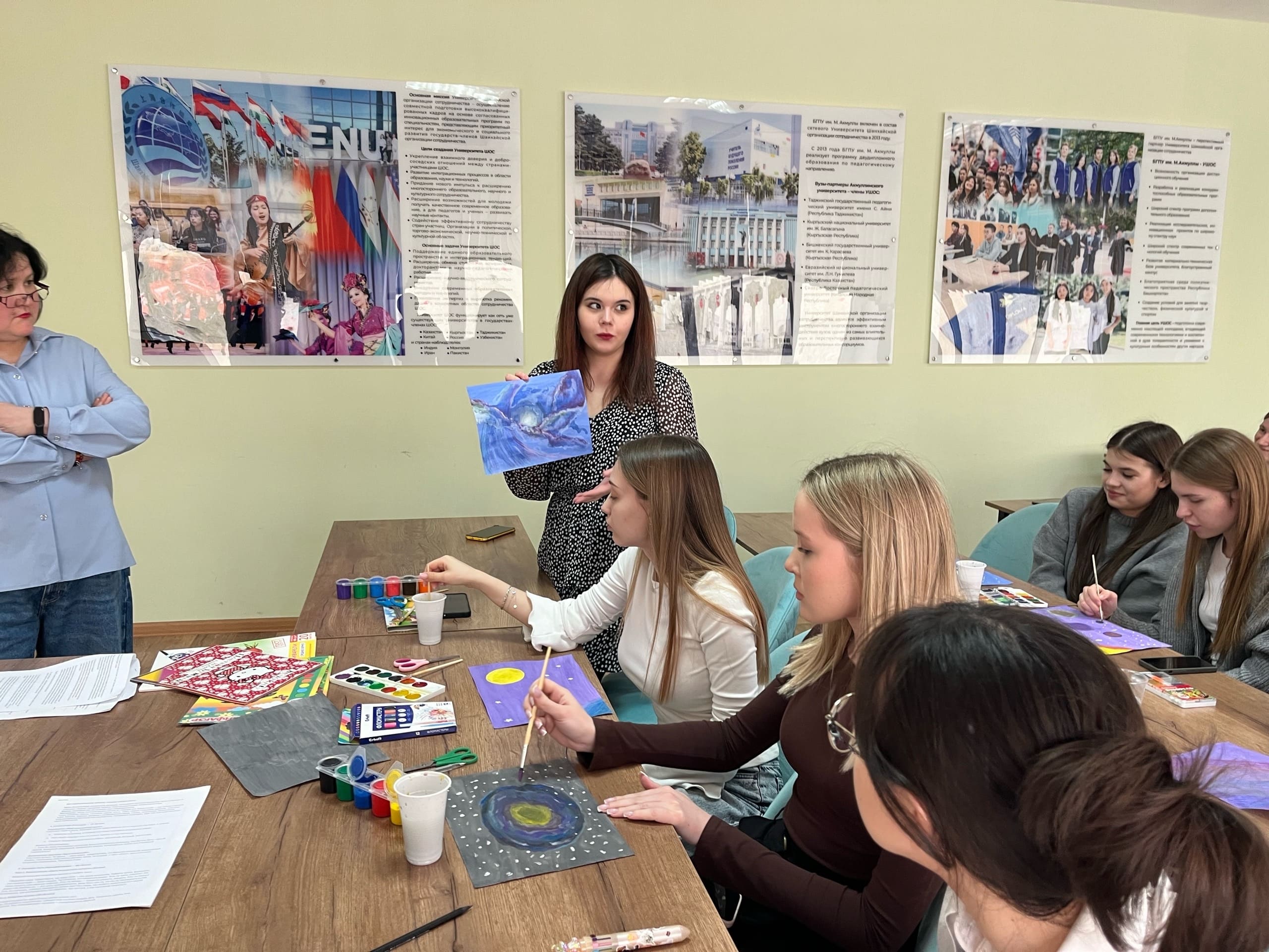 Кульминацией встречи стала арт-терапевтическая практика. Под звуки успокаивающей мелодии студенты рисовали космос на заранее затонированных листах «Карты внутреннего космоса». Тонированный фон помог ребятам расслабиться и выразить не столько «правильную» галактику, сколько свое личное, эмоциональное восприятие темы. Каждый рисунок стал искренним отражением того, что происходит внутри автора