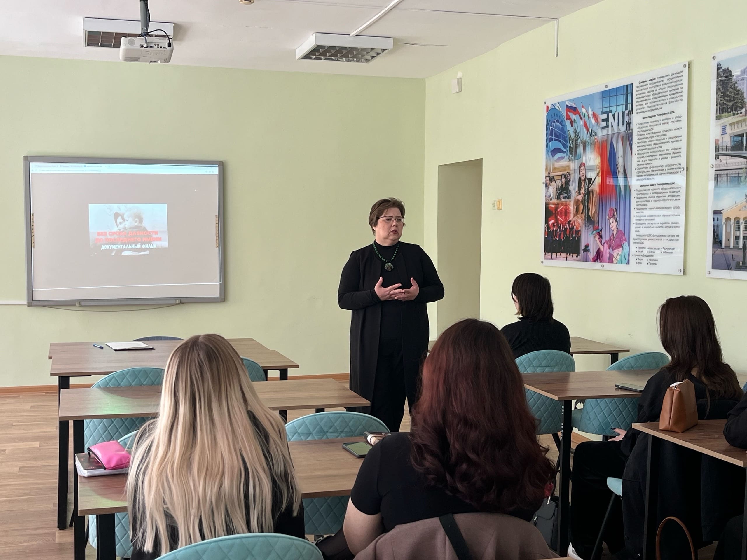 19 апреля в России — День единых действий в память о геноциде советского народа нацистами. В преддверии этой даты канд.пед.наук, доцент кафедры профессионального и социального образования Екатерина Владимировна Трофимова собрала студентов 3 курса ППОСП на просмотр документального фильма «Жертвоприношение. Дети» из цикла «Без срока давности». Картина страшная и честная: она о том, как нацисты убивали детей на оккупированной территории Краснодарского края — расстреливали, морили голодом, заставляли сдавать кровь до смерти, угоняли в рабство. Но главное в фильме — живые свидетельства выживших, их письма и дневники. Перед показом Екатерина Владимировна специально предупредила: «Я не буду рассказывать, что правильно думать. Я буду задавать вопросы. Будьте честными и уважайте чужую боль». И разговор действительно получился не лекцией, а диалогом. Самый острый момент наступил, когда преподаватель задала вопрос-провокацию: «Если бы вы допрашивали палача детей — какой один вопрос вы бы ему задали?» Одна из студенток ответила коротко, без лишних слов. И эта фраза прозвучала как приговор любой идеологии, которая делает детей расходным материалом: «А если это были бы ваши дети?» Цитата страшная своей прямотой, этически очень точная для этого фильма — она ломает любые абстрактные оправдания. В аудитории повисло напряжённое молчание. Именно в таком напряжении, по замыслу Екатерины Владимировны, и рождается понимание трагедии. Студенты учатся быть педагогами, а значит — воспитывать других. Такие обсуждения нужны им, чтобы самим знать правду о войне и уметь без фальши, без пафоса, но с уважением говорить о ней с детьми и подростками.