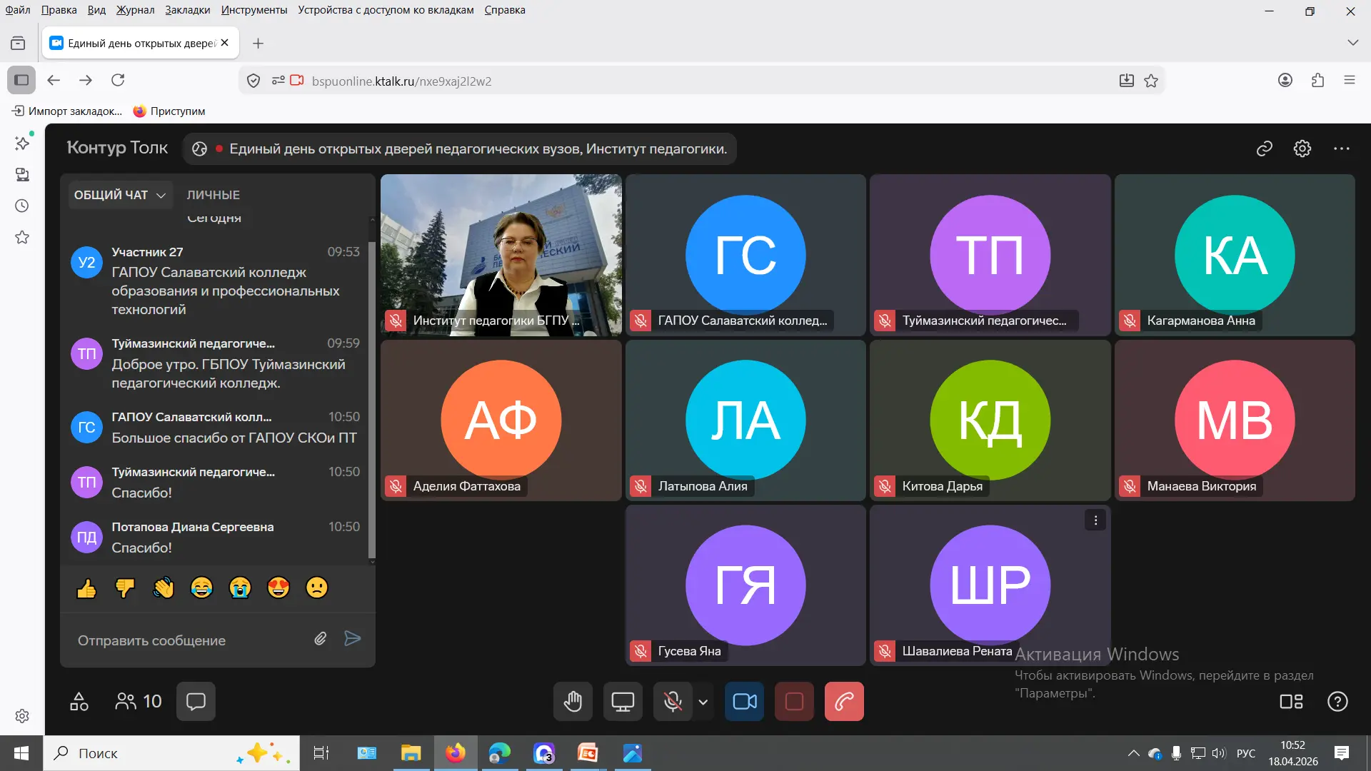 К онлайн-собранию подключилось 164 студента из таких образовательных организаций СПО, как Туймазинский педагогический колледж, Нефтекамский педагогический колледж, Месягутовский педагогический колледж, Кушнаренковский многопрофильный профессиональный колледж им.Д.Мурзина, Уфимский многопрофильный профессиональный колледж, Стерлитамакский многопрофильный профессиональный колледж, Салаватский колледж образования и профессиональных технологий и другие.