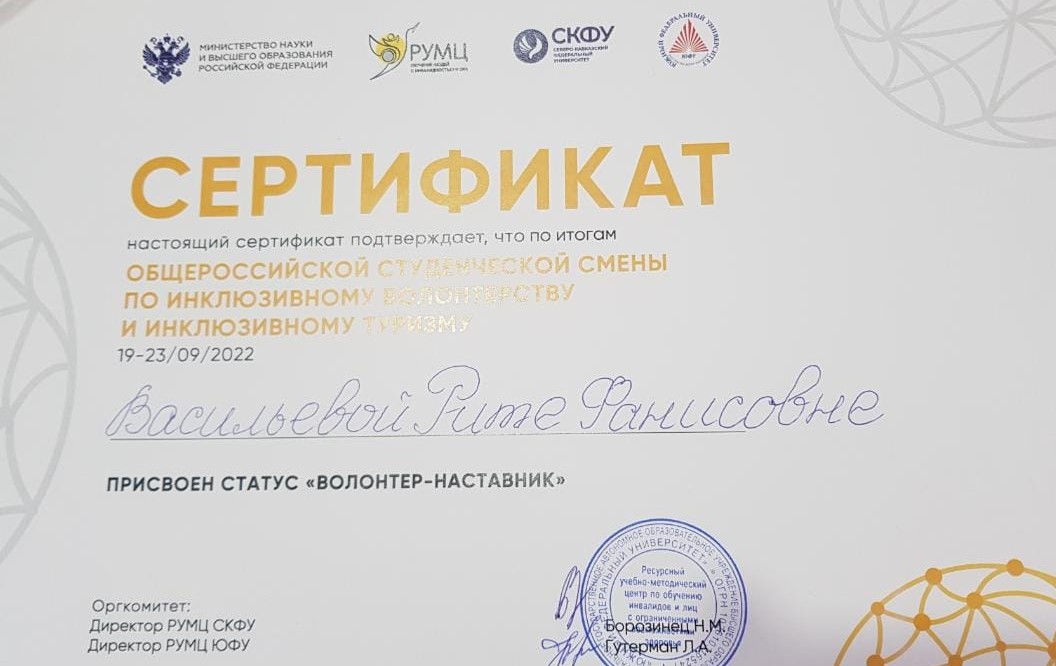 С 19 сентября по 23 сентября 2022 года в городе Пятигорске на площадках Южного федерального университета и Северо-Кавказского федерального университета прошел очный этап Общероссийской студенческой смены по инклюзивному волонтерству и инклюзивному туризму. Смена направлена на подготовку авангардного инклюзивного волонтерского корпуса из числа обучающихся в образовательных организациях высшего образования Российской Федерации, нацеленного на активизацию деятельности волонтерских центров/объединений и развитие молодежных инициатив в сфере инклюзии. Такое тематическое мероприятие было организовано для студентов российских вузов впервые.