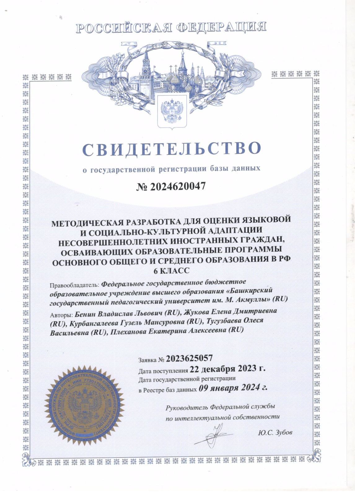 «Методическая разработка для оценки языковой и социально-культурной адаптации несовершеннолетних иностранных граждан, осваивающих образовательные программы основного общего и среднего образования в РФ» для 5-11 классов разработаны коллективом авторов: Бениным Владиславом Львовичем, Жуковой Еленой Дмитриевной, Курбангалеевой Гузель Мансуровной, Тугузбаевой Олесей Васильевной, Плехановой Екатериной Алексеевной.