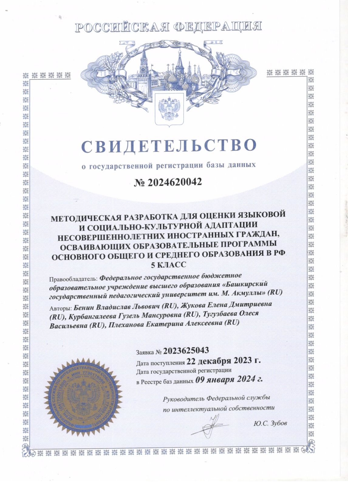 Разработчиками БГПУ им. М. Акмуллы получено свидетельство о государственной регистрации базы данных