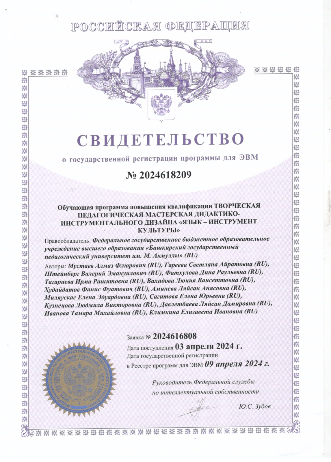 Разработчиками БГПУ им. М. Акмуллы получено свидетельство о государственной регистрации программ для ЭВМ
