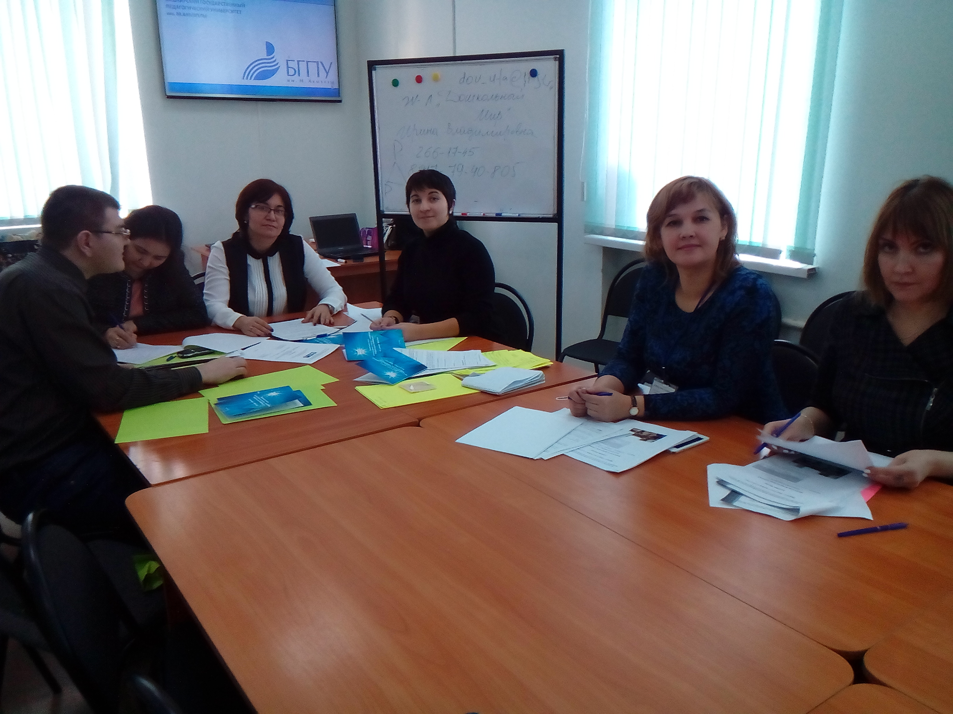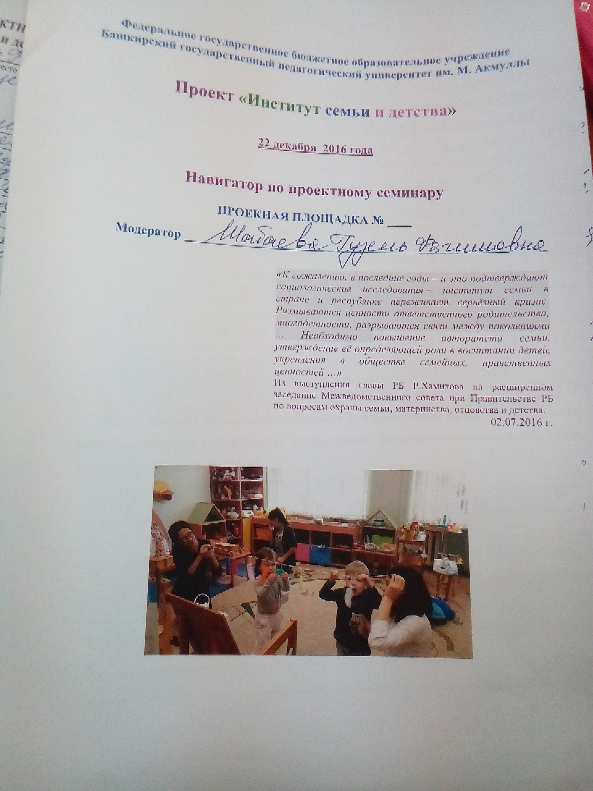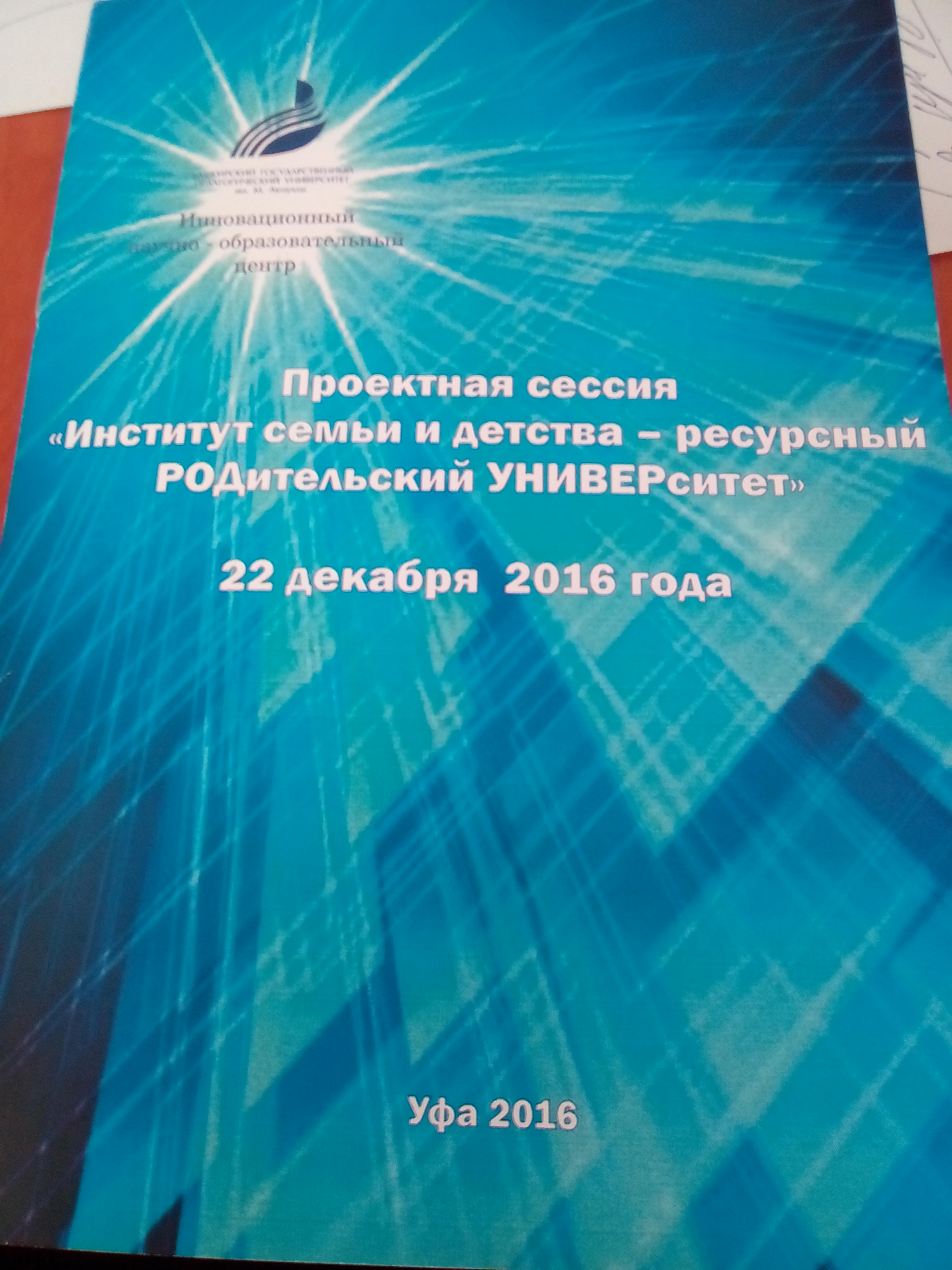 22 декабря 2016 в учебном корпусе № 3, ауд. 408 в рамках проектного семинара «БГПУ им. М.Акмуллы»: «Педагогический университет в региональном пространстве создания инноваций» кафедра дошкольной педагогики и психологии ИП (зав.каф. Боронилова И.Г., доц. Шабаева Г.Ф., доц. Сыртланова Н.Ш., доц. Акчулпанова А.А.) совместно с другими структурными подразделениями университета приняли активное участие в проектной сессии – «Разработка паспортов приоритетных проектов стратегического развития «БГПУ им. М. Акмуллы» до 2020 г. – проект «Институт семьи и детства – ресурсный родительский университет», руководители: проф. Исламова З.И.; доц. Хайртдинова Л.Ф.