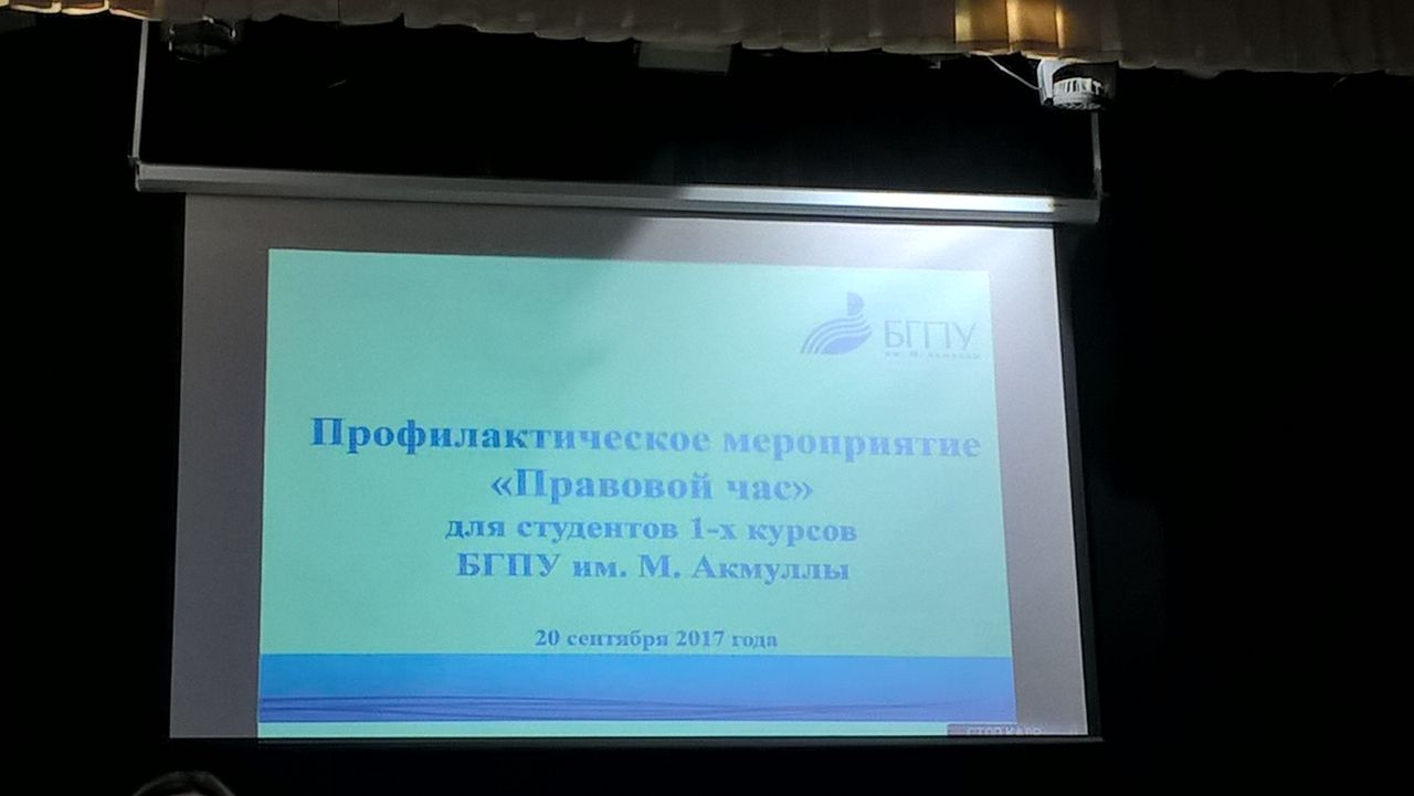 20 сентября 2017 года ФГБОУ ВО «БГПУ им. М. Акмуллы» совместно с  Министерством внутренних дел по Республике Башкортостан, Управлением ФСБ по РБ, Управлением ГИБДД по РБ, ГБУЗ РБ Поликлиника № 1провели для студентов 1 курсов БГПУ им. М. Акмуллы профилактическое мероприятие в корпусе № 2.