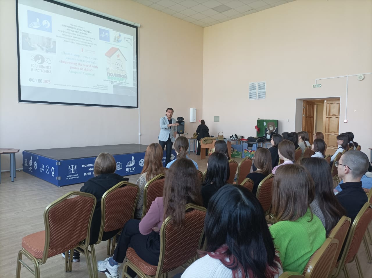 Научно-методический семинар с мастер-классом в соответствии с требованиями ФОП ДО, ФГОС ДО на кафедре ДПиП по театрализованной деятельности воспитанников  с приглашенным  кинорежиссером и детским писателем по постановке и показу в Акмуллинском университете Спектакль-парад ко Дню Победы "Военно-полевой концерт: История большой победы для маленьких зрителей " - как продукт социально-образовательного инжиниринга кафедры ДПиП