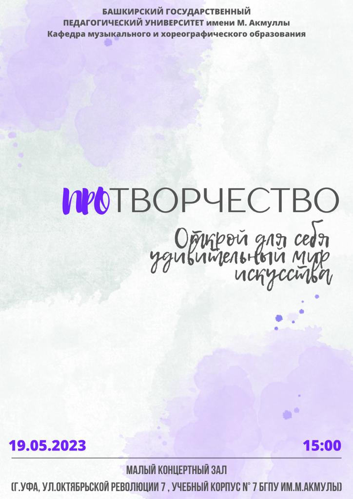 Концерт состоится 19 мая 2023 года в 15.00 ч. в Малом зале Акмуллинского университета (ул. Октябрьской революции, 7)