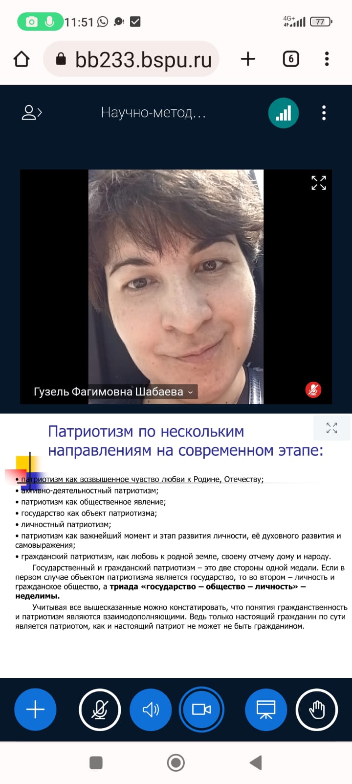 31 мая 2023 года Шабаева Г.Ф., к.п.н., доц., и.о. зав.каф.ДПиП Института педагогики БГПУ имени Мифтахетдина Акмуллы приняла участие в тринадцатой встрече методологического семинара Исследовательского Консорциума «Развитие личностного потенциала в образовании». Выступила с докладом "Современная подготовка студентов на базе мастерской проф мастерства и ЦРК, технопарка универсальных педагогических компетенций ВУЗа в условиях реализации проекта по современным технологиям раннего развития детей в полилингвальном и поликультурном пространстве детства. Тема встречи: «Роль обратной связи в развитии личностного потенциала учеников и учителей. Разбор кейсов проекта «Мастерские роста».
