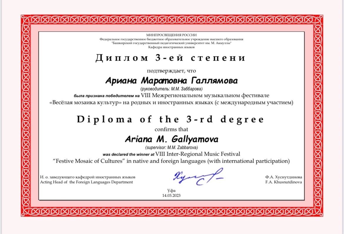 Ариана Галлямова (класс к.п.н., доцента кафедры Заббаровой М. М.) - Лауреат III степени.