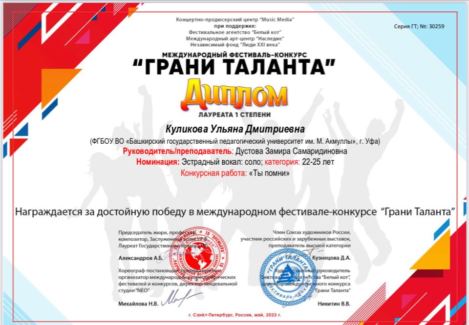 Студенты кафедры музыкального и хореографического образования Института педагогики БГПУ им. М. Акмуллы  вошли в число победителей Международного фестиваля -конкурса «Грани таланта», который проходил в г. Санкт-Петербург.