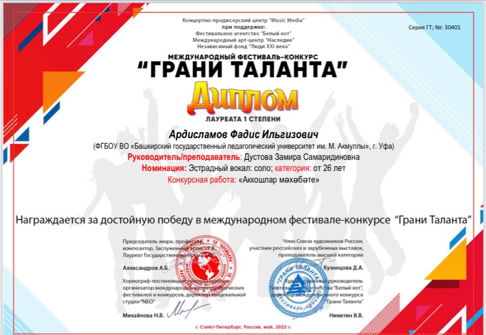 Диплом лауреата I  степени - Ардисламов Фадис (номинация "Вокальное искусство" (эстрадный вокал), от 26 лет).