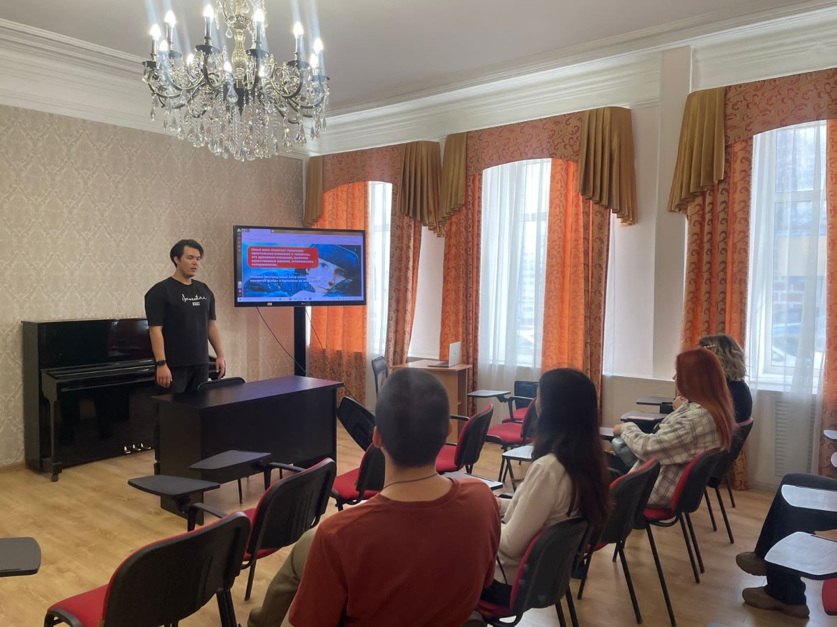 16 октября 2023 года на кафедре музыкального и хореографического образования в рамках тематического плана занятий "Разговоры о важном" состоялась беседа  на тему "По ту сторону экрана. 115 лет кино в России" со студентами 1 курса направления подготовки "Педагогическое образование", профиля "Музыкальное образование" под руководством куратора преподавателя Бакиева Рафаэля Рифовича.