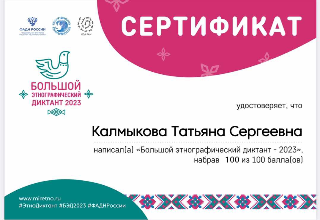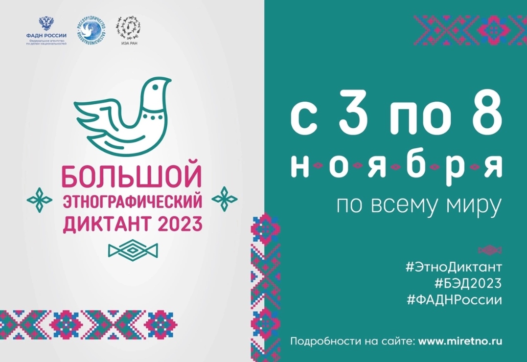 С 3 по 8 ноября 2023 года все желающие смогут стать участниками акции «Большой этнографический диктант», который проходит в онлайн-формате на сайте:www.miretno.ru. Задания Диктанта оформлены в виде теста.